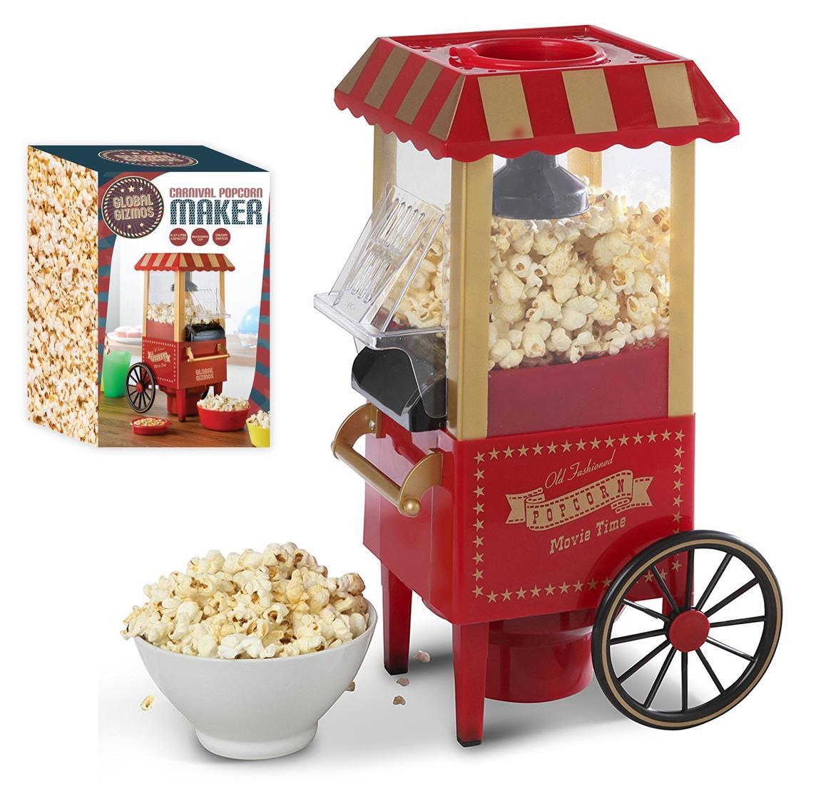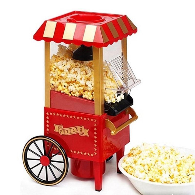 Masina retro de facut floricele Popcorn Maker Aparat de facut floricele de porumb este o replica in miniatura a celebrelor aparate de facut popcorn de la inceputul anilor 1900.Nu mai pierde timpul preparand floricele, cu aparatul de facut floricele de porumb Old Fashioned TV521, floricelele sunt gata in doar cateva minute, doar adauga boabele de porumb si lasa aparatul sa faca restul. Aparatul de popcorn poate fi folosit atat in bucatarie cat si in camera, la film. Are un design deosebit, placut si interesant, cu recipient transparent ce previne stropirea cu ulei sau imprastierea floricelelor, gura pentru varsarea floricelelor facute intr-un vas, si un sistem de alimentare pentru porumb cu capac. Floricelele de porumb se fac prin circulatia aerului cald. voltaj:220-230 V/50 Hz consum: 1200 W material: plastic culori: rosu, auriu dimensiuni: inaltime: 39 cm / lungime: 23 cm / latime: 18 cm