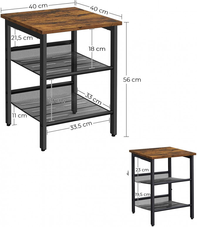 Specificații: - Culoare: Maro rustic - Material: Plăci PAL, metal - Dimensiune produs: 40 x 40 x 55 cm (L x l x H) - Greutate produs: 3,8 kg - Max Capacitatea de încărcare statică a mesei: 20 kg - Max Capacitate de încărcare statică pe raft cu plasă: 5 kg Conținutul pachetului: - 1 x masă laterală - 1 x cheie hexagonală - 1 x kit de accesorii - 1 x instrucțiuni (EN, DE, ES, FR, IT)