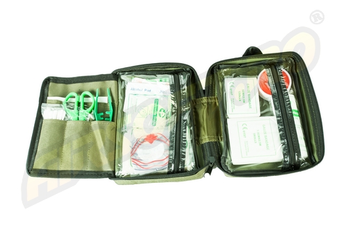 Tasca per pronto soccorso con cerniera e tasca trasparente che contiene:Cotton fioc 8 cm - 10 pzTamponi di preparazione allalcool - 3 x 6 cm - 4 pzForbici 12,5 cm- 1 pzPinzette - 11 cm - 1 pzCerotto adesivo - 72 x 19 mm - 8 pzTampone di garza sterile -