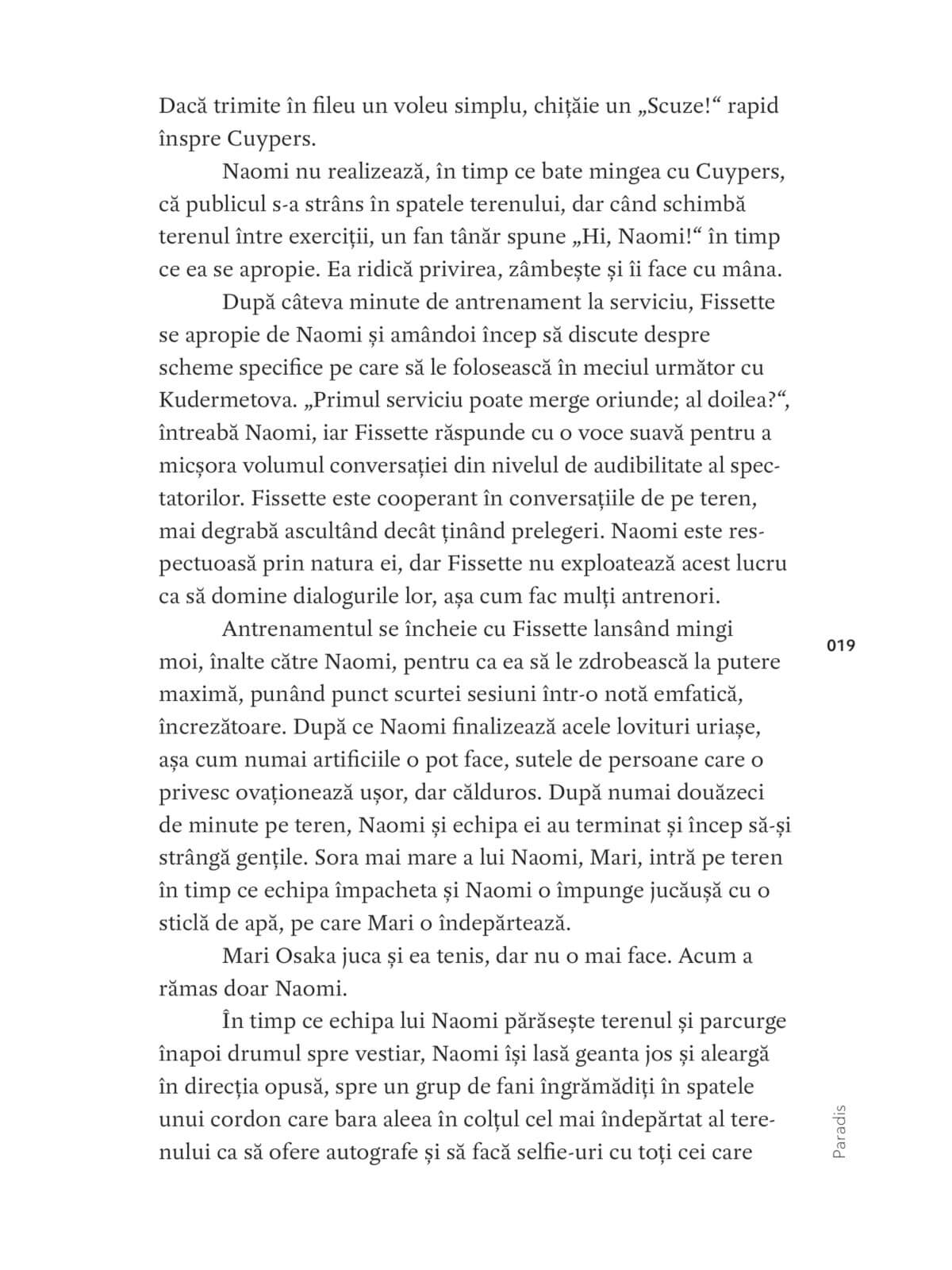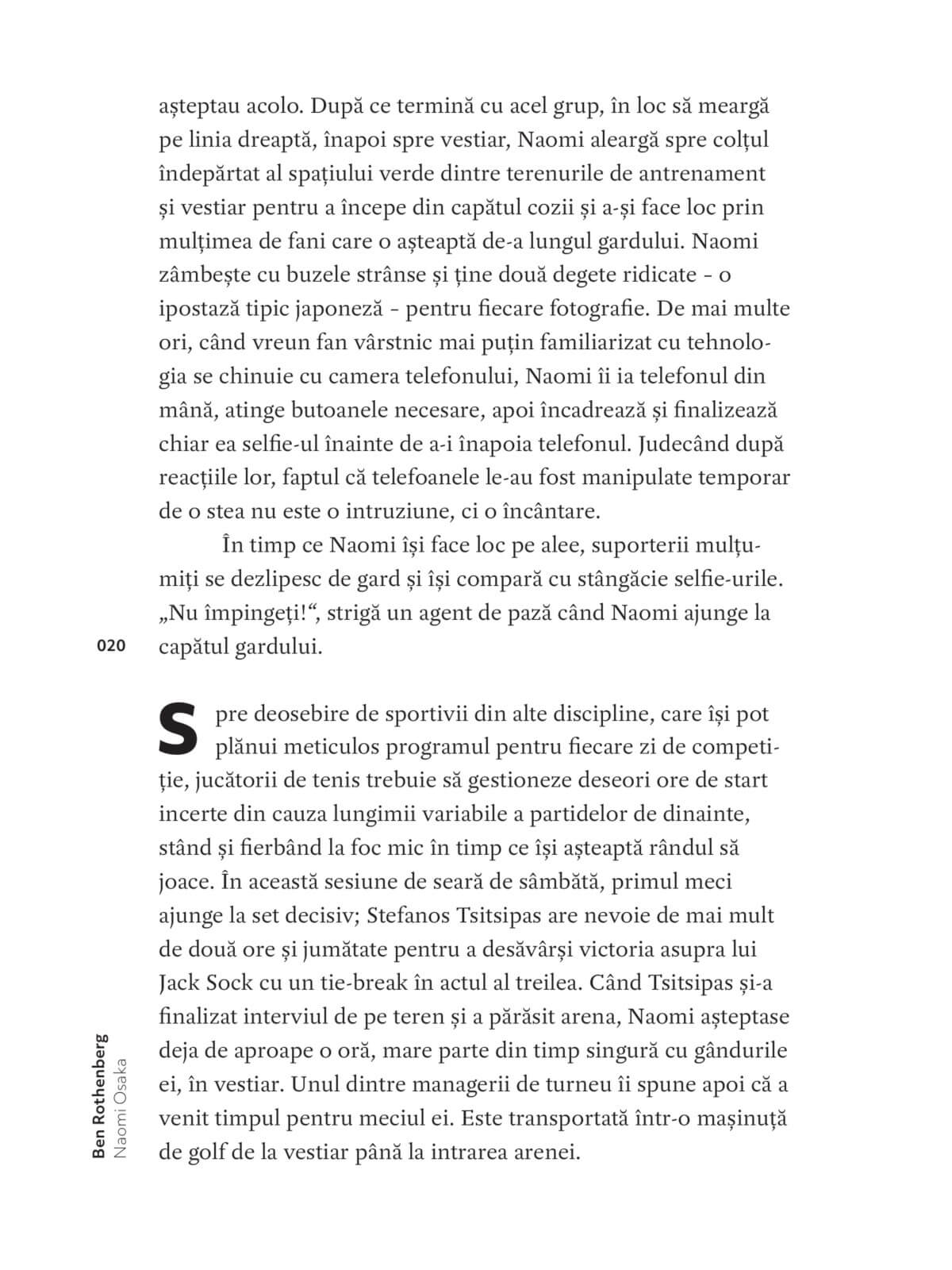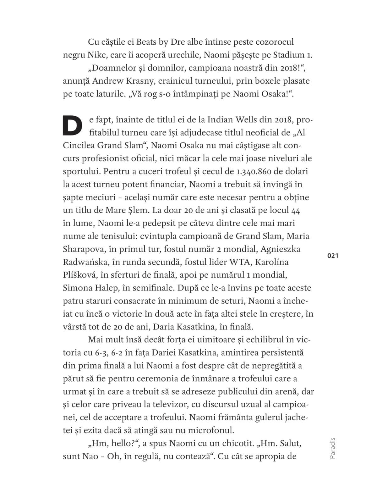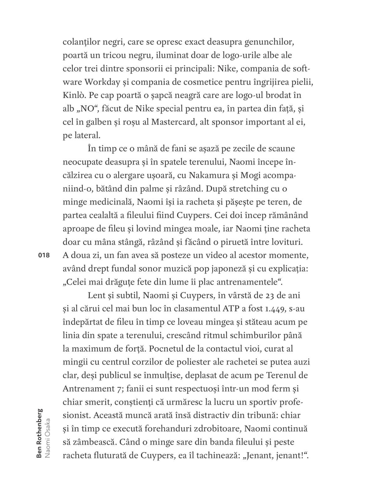 O biografie profunda si revelatoare a fenomenului tenisului si a activistei Naomi Osaka, care spune povestea nestiuta din spatele carierei sale, a actiunilor ei de sustinere a justitiei rasiale si a sanatatii mintale, precum si provocarilor unei vieti in lumina reflectoarelor internationale.Chiar daca a devenit una dintre cele mai bine platite sportive din istorie, povestea calatoriei familiei haitiano-japonezo-americane prin lume pentru a-si urma visurile in tenis a ramas putin cunoscuta.Ben Rothenberg arata nu numai de unde a venit Osaka, ci si incotro se indreapta, in timp ce revine la tenisul competitiv dupa un an de concediu de maternitate. Prin explorarea fascinanta a modului in care Osaka a schimbat jocul pe teren si in afara lui, Rothenberg detaliaza impactul incredibil pe care ea l-a avut in sport, media, afaceri, justitie sociala si asupra conceptului de sanatate mintala.