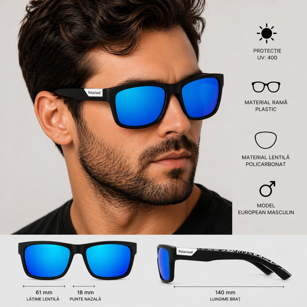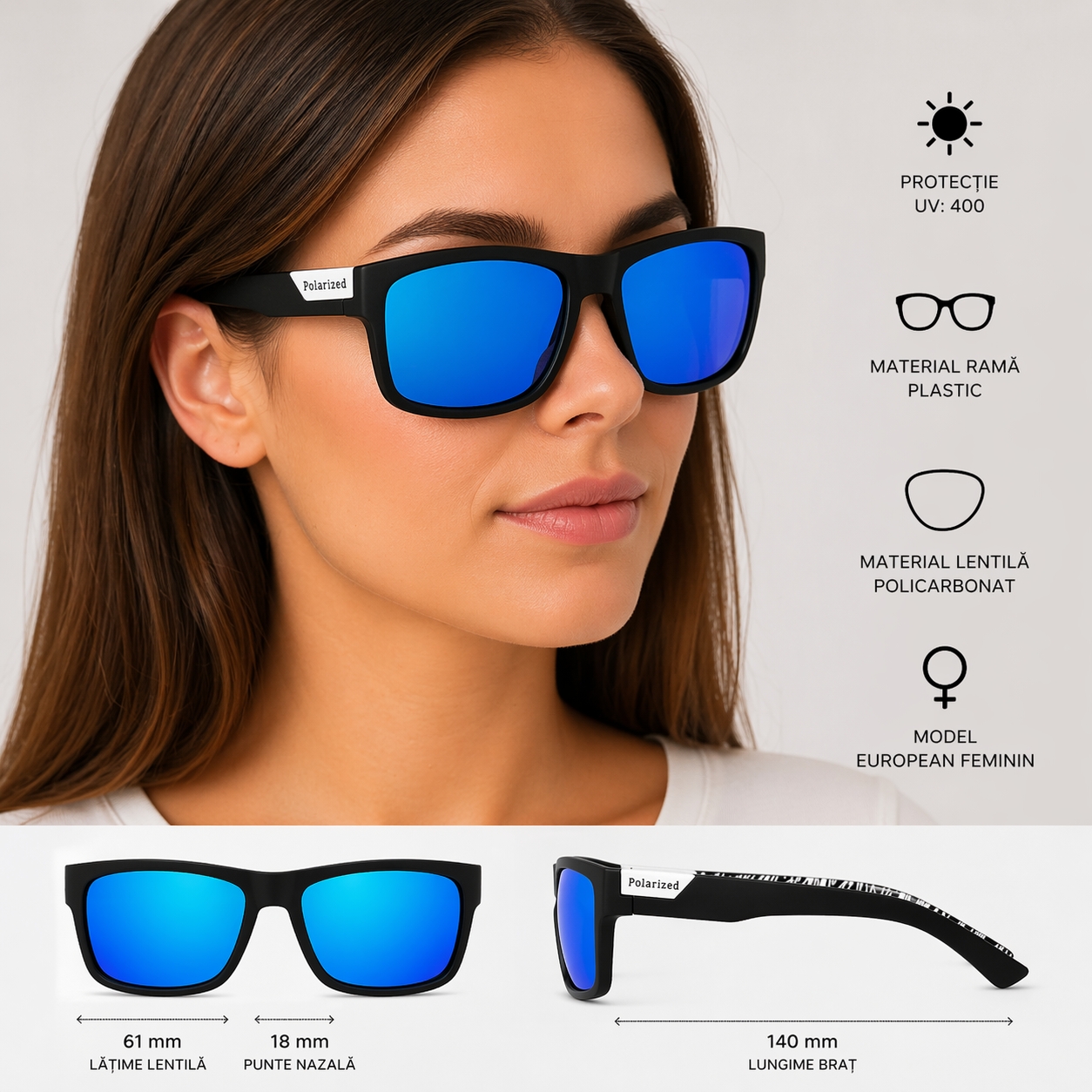 protectie UV: 400 material rama: plastic; material lentila: ploicarbonat; latime lentila: 61 mm; marime punte nazala: 18 mm; lungime brat: 140 mm. Important : A se evita socurile termice si mecanice, zgarierea, contactul cu alcool, parfum, acetona, detergent, suprafete abrazive.