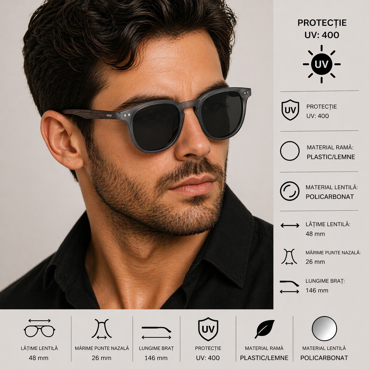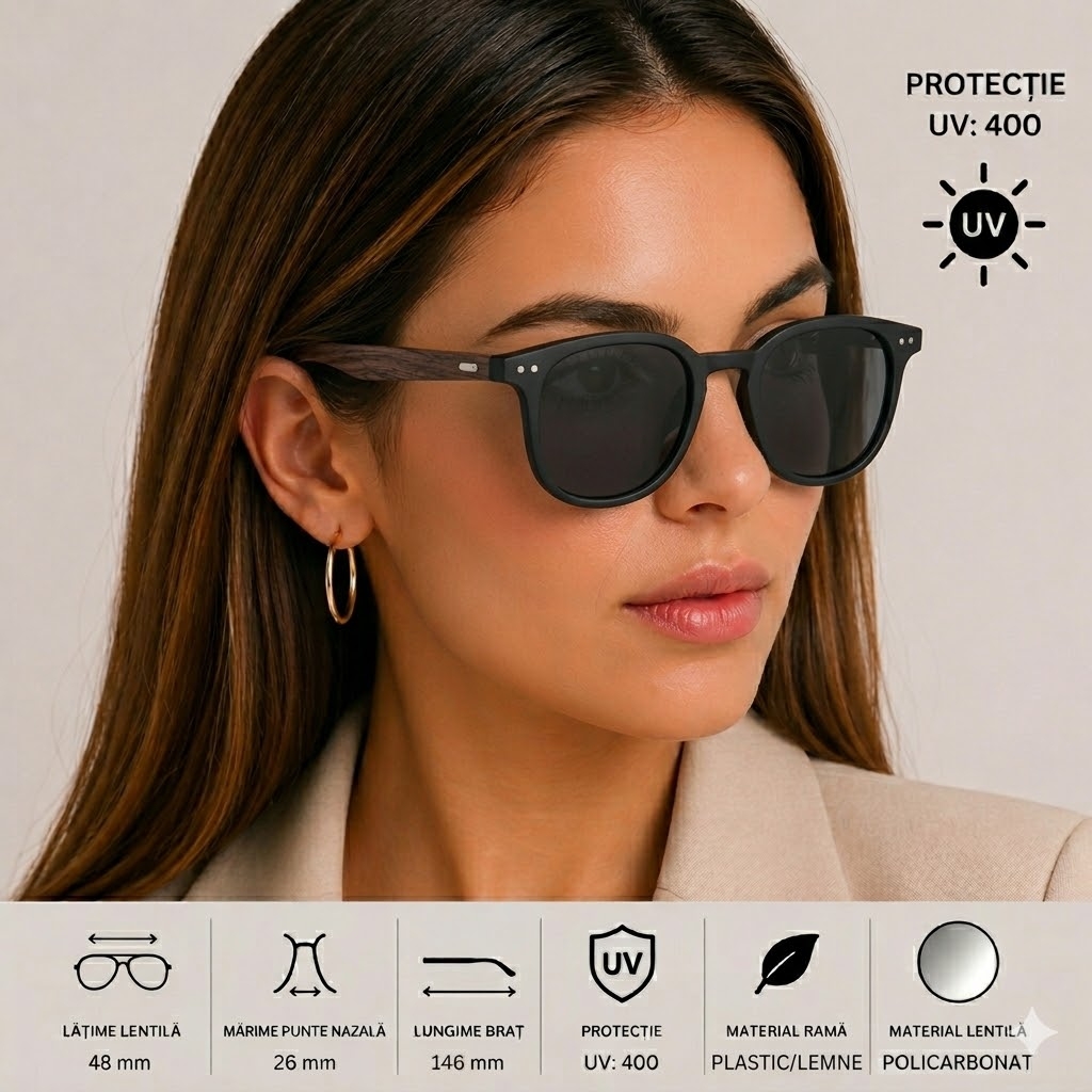 protectie UV: 400 material rama: plastic; material lentila: ploicarbonat; latime lentila: 48 mm; marime punte nazala: 26 mm; lungime brat: 146 mm. Important : A se evita socurile termice si mecanice, zgarierea, contactul cu alcool, parfum, acetona, detergent, suprafete abrazive.
