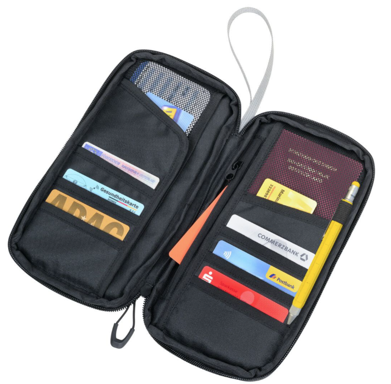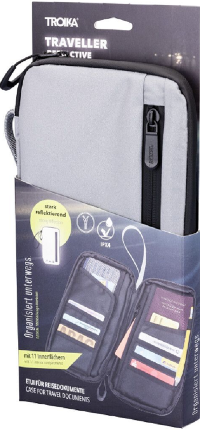Carcasa noastra pentru documente nu este doar sediul dumneavoastra organizational, ci si insotitorul dumneavoastra stralucitor. Cu material reflectorizant, va asigura ca sunteti mereu in centrul atentiei, chiar si in cele mai aventuroase situatii de calatorie. Calatoreste cu stil si siguranta, mereu in lumina! Cu 12 compartimente interioare pentru documente de calatorie, o bucla pentru stilou si un fermoar pe toata lungimea, ofera tot ce te-ai astepta de la un suport inteligent pentru documente.Husa pentru documente de calatorie, cu fermoare impermeabile si curea de mana, foarte reflectorizant, buzunar frontal potrivit pentru smartphone sau pasaport, 11 compartimente interioare pentru carduri si documente de calatorie, bucla pentru stilou, 100% poliester, poliester, griHusa REFLACTIVE TRAVELER este foarte reflectorizanta, oferind o vizibilitate sporita la amurg sau in intuneric pentru calatorii in siguranta.Cu fermoare rezistente la apa si material din poliester de inalta calitate, husa este ideala pentru toate conditiile meteorologice si calatoriile lungi.Cele 11 compartimente interioare, bucla pentru stilou si buzunarul frontal pentru smartphone sau pasaport permit organizarea clara a cardurilor si a documentelor de calatorie.Manevrare confortabila: cureaua de mana il face usor de transportat, in timp ce designul gri ofera carcasei un aspect modern si elegant.