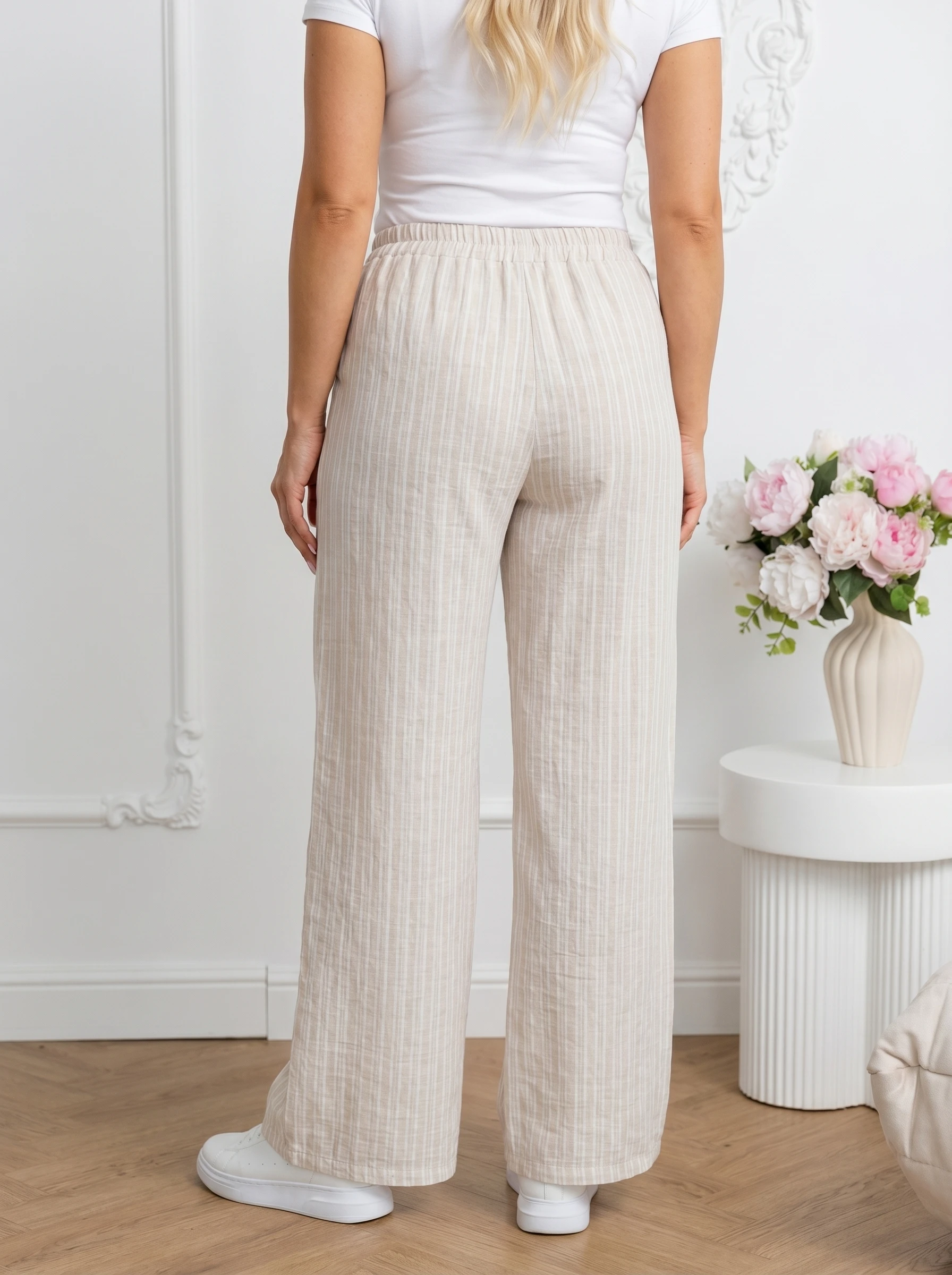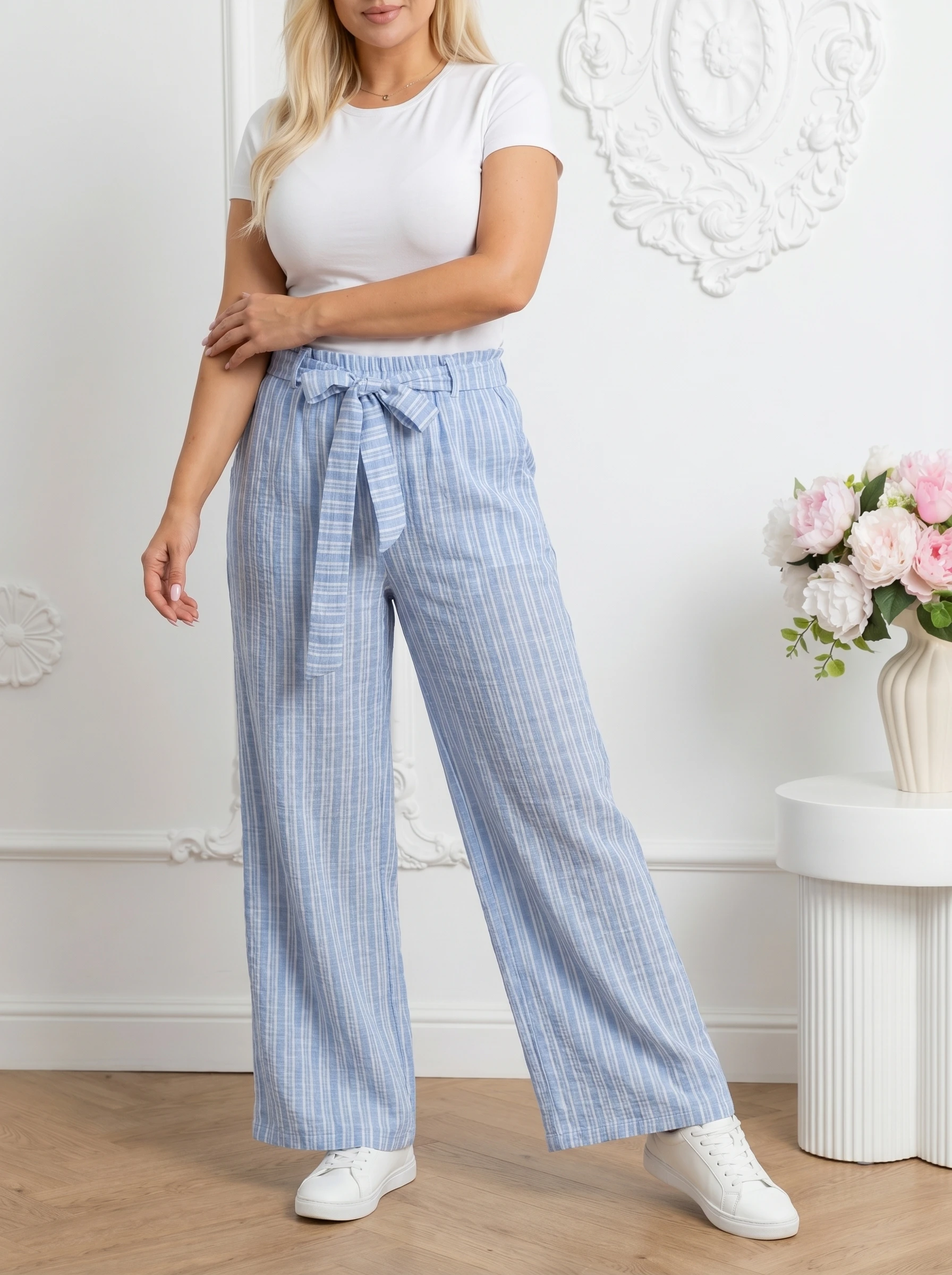 Pantaloni din material vaporos cu imprimeu in dungi si cordon, piesa ideala pentru un look de vara relaxat si plin de stil, oferind libertate de miscare si un confort termic sporit. Designul se remarca prin croiala de tip palazzo, cu picior larg si fluid,