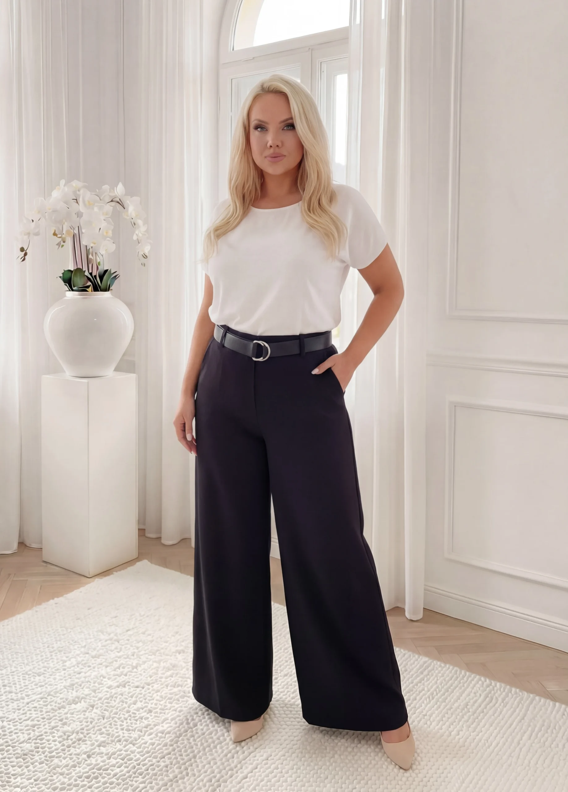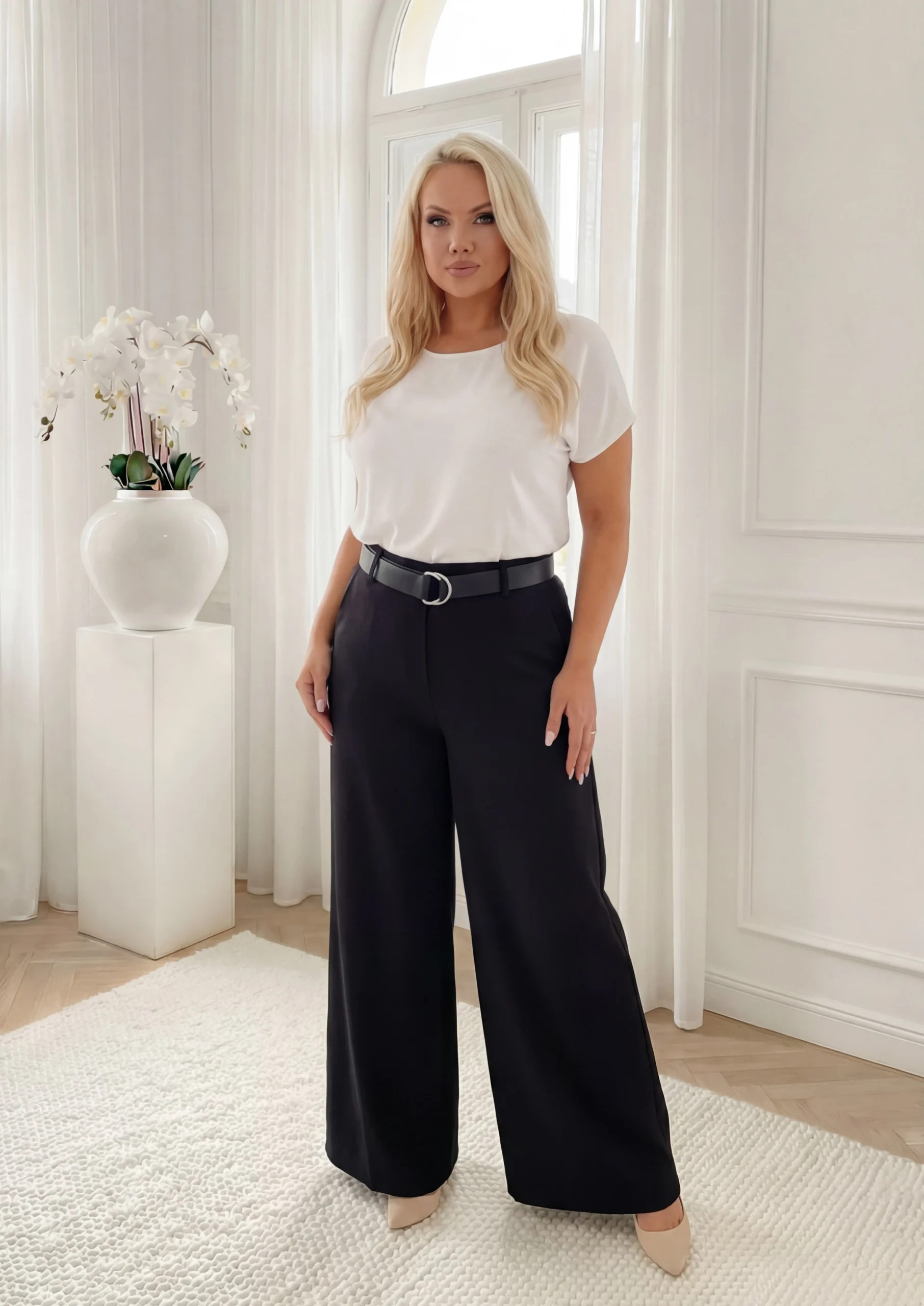 Pantaloni eleganti negri cu talie inalta, croi larg tip palazzo, cu curea, alegerea perfecta pentru un look rafinat si actual. Croiala larga tip palazzo si talia inalta avantajeaza silueta, oferind un efect de alungire si eleganta. Modelul este prevazut c