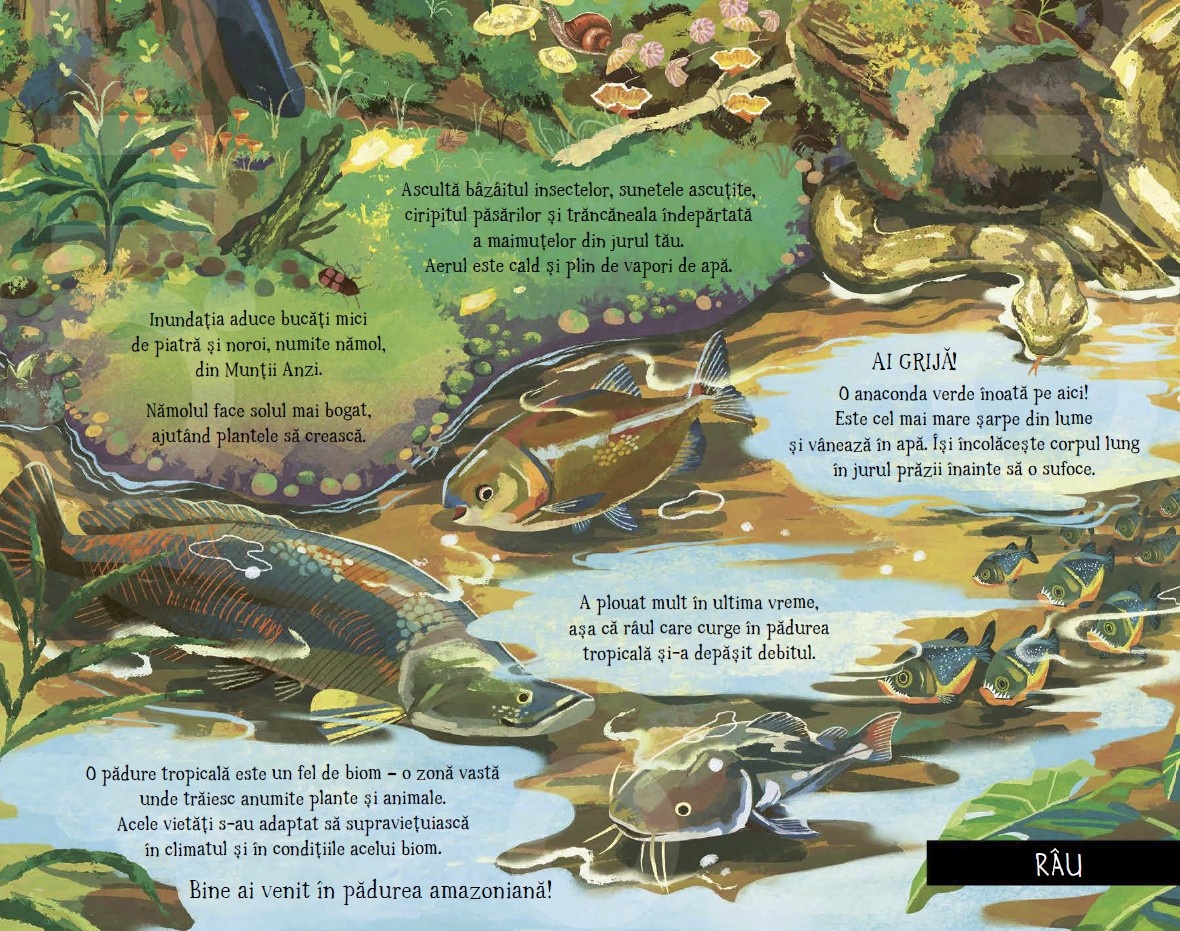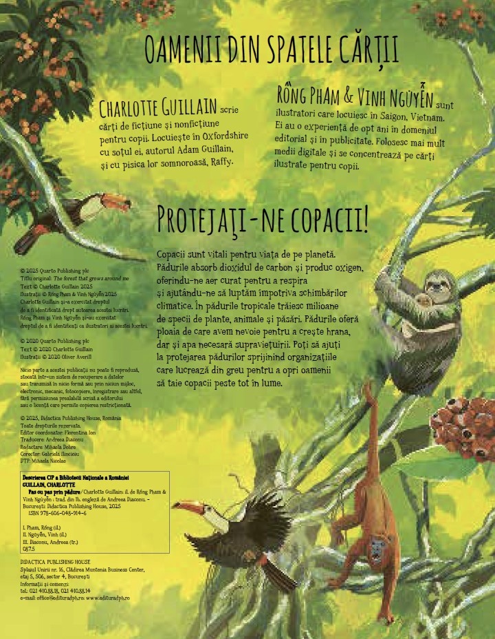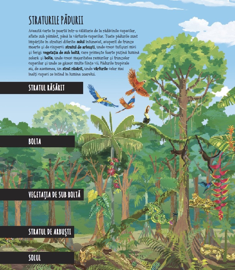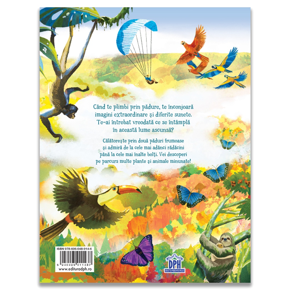 Pas cu pas prin pădure este o carte ilustrată despre pădure tropicală care îi invită pe copii să descopere, pas cu pas, viața dintr-un ecosistem fascinant. Explorarea pădurii, de la sol la copacii înalți Pornind de la nivelul solului și urcând treptat spre bolta copacilor, cartea arată cum trăiesc plantele și animalele, cum se influențează unele pe altele și cum funcționează pădurea ca un tot unitar. Fiecare pagină dezvăluie detalii despre insecte, păsări, mamifere și plante, explicând clar unde trăiesc și de ce au nevoie pentru a supraviețui. Informații clare, ușor de înțeles Textele scurte și ilustrațiile ample prezintă concepte precum fotosinteza, adaptarea la mediu și rolul pădurilor în reglarea climei, pe înțelesul copiilor. O carte despre protejarea naturii Copiii află de ce copacii sunt esențiali pentru aerul pe care îl respirăm și de ce protejarea pădurilor este importantă pentru viața pe planetă. O carte educativă despre natură, ideală pentru copiii care vor să înțeleagă lumea din jurul lor și pentru proiecte școlare. Caracteristici: Autor: Charlotte Guillain Mărimi: 25 x 32 Pagini: 20 Vârstă: 6 ani + Copertă: cartonată