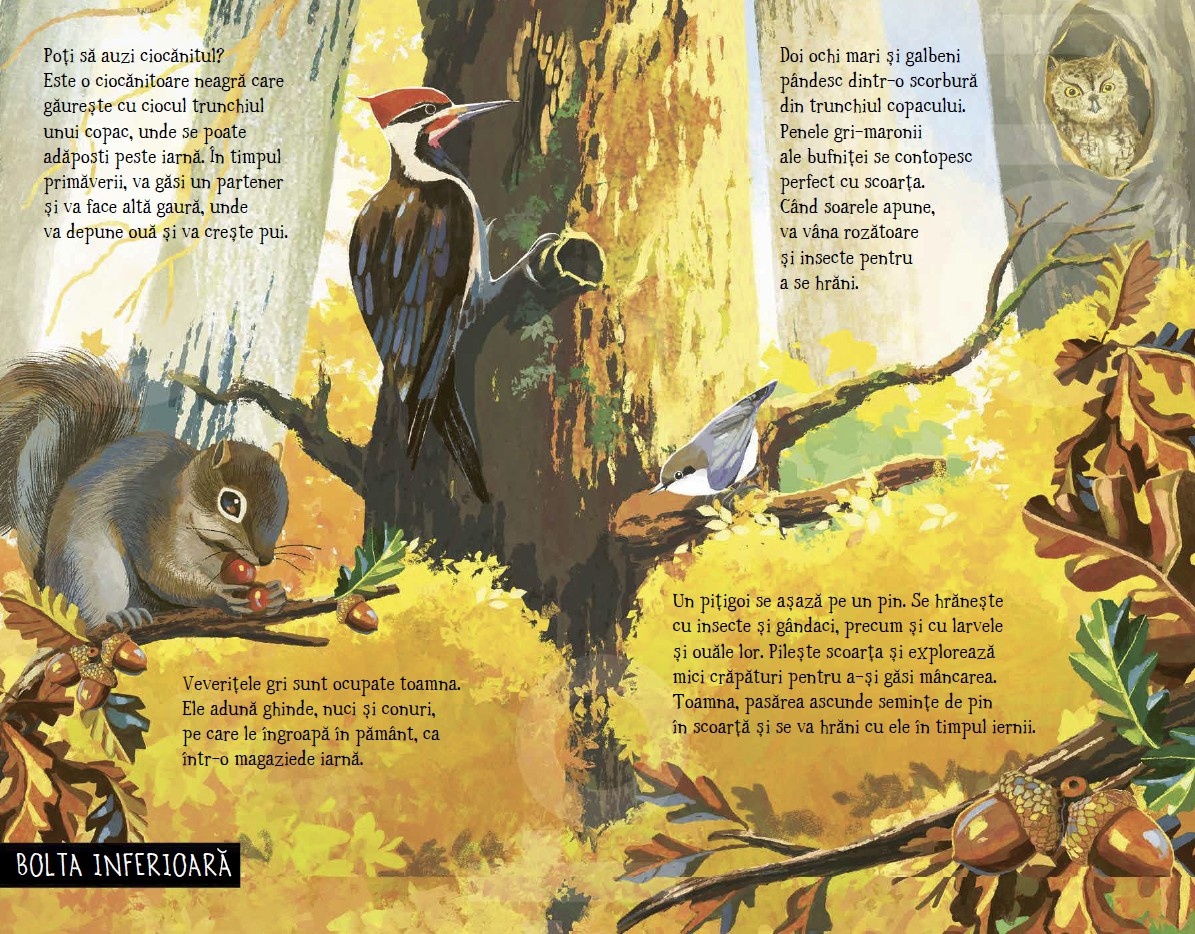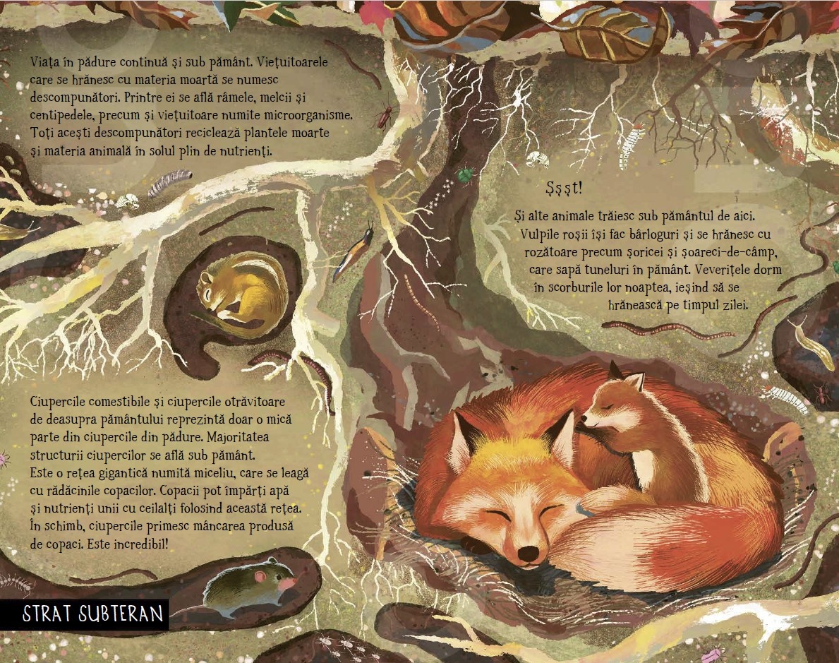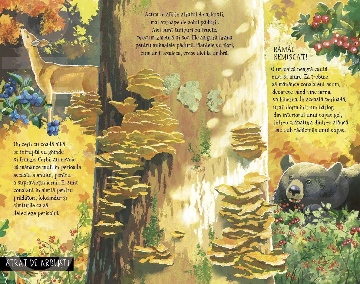 Pas cu pas prin pădure este o carte ilustrată despre pădure tropicală care îi invită pe copii să descopere, pas cu pas, viața dintr-un ecosistem fascinant. Explorarea pădurii, de la sol la copacii înalți Pornind de la nivelul solului și urcând treptat spre bolta copacilor, cartea arată cum trăiesc plantele și animalele, cum se influențează unele pe altele și cum funcționează pădurea ca un tot unitar. Fiecare pagină dezvăluie detalii despre insecte, păsări, mamifere și plante, explicând clar unde trăiesc și de ce au nevoie pentru a supraviețui. Informații clare, ușor de înțeles Textele scurte și ilustrațiile ample prezintă concepte precum fotosinteza, adaptarea la mediu și rolul pădurilor în reglarea climei, pe înțelesul copiilor. O carte despre protejarea naturii Copiii află de ce copacii sunt esențiali pentru aerul pe care îl respirăm și de ce protejarea pădurilor este importantă pentru viața pe planetă. O carte educativă despre natură, ideală pentru copiii care vor să înțeleagă lumea din jurul lor și pentru proiecte școlare. Caracteristici: Autor: Charlotte Guillain Mărimi: 25 x 32 Pagini: 20 Vârstă: 6 ani + Copertă: cartonată
