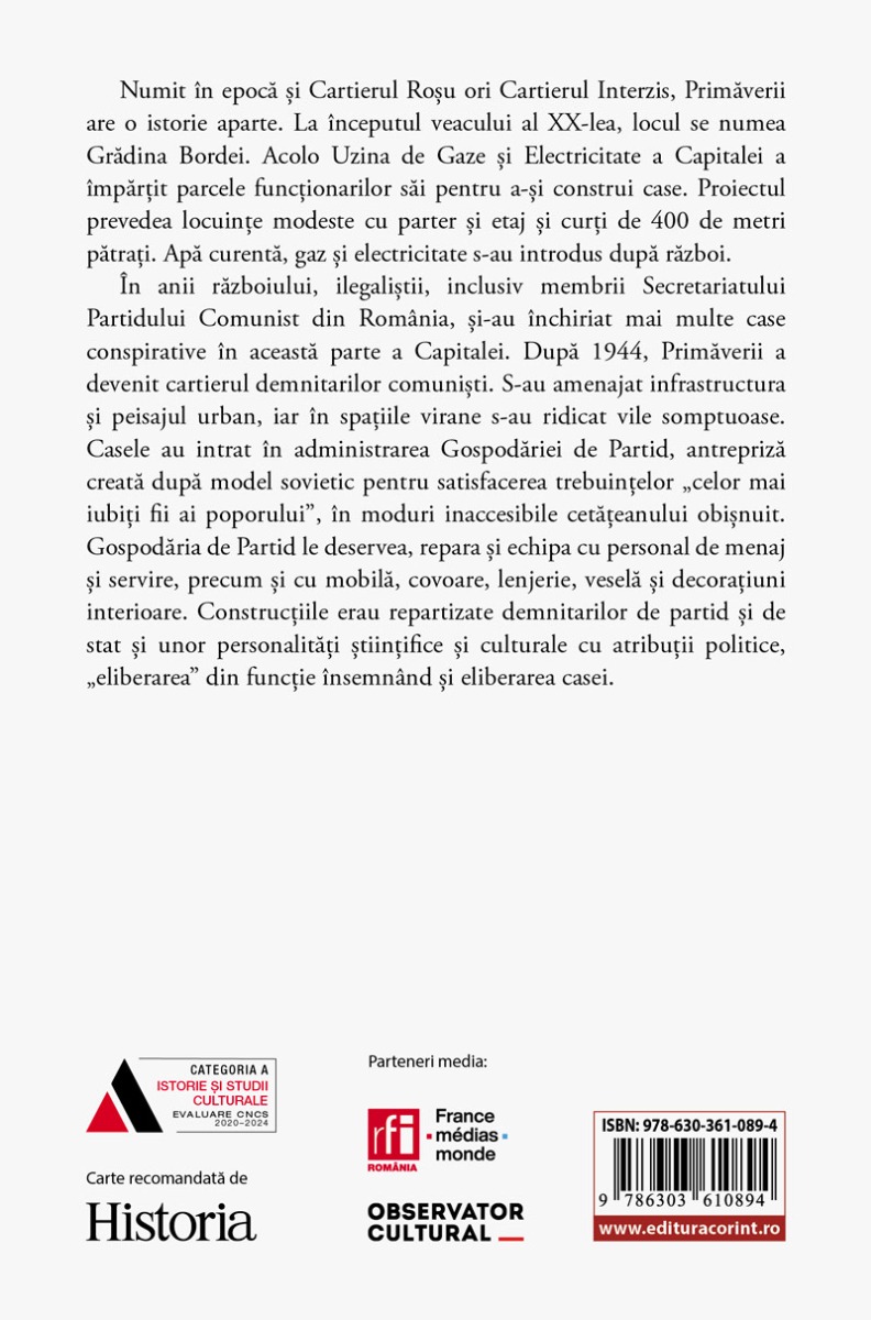 #html-body [data-pb-style=XF0G0OB]{justify-content:flex-start;display:flex;flex-direction:column;background-position:left top;background-size:cover;background-repeat:no-repeat;background-attachment:scroll}Numit în epocă și Cartierul Roșu ori Cartierul Interzis, Primăverii are o istorie aparte. La începutul veacului al XX-lea, locul se numea Grădina Bordei. Acolo Uzina de Gaze și Electricitate a Capitalei a împărțit parcele funcționarilor săi pentru a-și construi case. Proiectul prevedea locuințe modeste cu parter și etaj și curți de 400 de metri pătrați. Apă curentă, gaz și electricitate s-au introdus după război. În anii războiului, ilegaliștii, inclusiv membrii Secretariatului Partidului Comunist din România, și-au închiriat mai multe case conspirative în această parte a Capitalei. După 1944, Primăverii a devenit cartierul demnitarilor comuniști. S-au amenajat infrastructura și peisajul urban, iar în spațiile virane s-au ridicat vile somptuoase. Casele au intrat în administrarea Gospodăriei de Partid, antrepriză creată după model sovietic pentru satisfacerea trebuințelor „celor mai iubiți fii ai poporului”, în moduri inaccesibile cetățeanului obișnuit. Gospodăria de Partid le deservea, repara și echipa cu personal de menaj și servire, precum și cu mobilă, covoare, lenjerie, veselă și decorațiuni interioare. Construcțiile erau repartizate demnitarilor de partid și de stat și unor personalități științifice și culturale cu atribuții politice, „eliberarea” din funcție însemnând și eliberarea casei. Din cuprins: • Mândra Gheorghiu, despre „Gheorghiu-Dej, bunicul meu…” • Paul Sfetcu, despre cei 13 ani din anticamera lui Gheorghiu-Dej • Cu Gheorghe Gaston Marin, despre Rezistența franceză, electrificare, Canal, Kremlin, Casa Albă… • Ștefan Sârbu, nepotul lui Ștefan Foriș, despre trei generații în vârtejul politicii • Ion Filimon Sârbu, fiul logodnicei lui Gheorghiu-Dej, despre romantismul revoluționar al ilegaliștilor • Tatiana Brătescu, fiica lui Marcel și a Anei Pauker, despre copiii Cominternului • Valeriu Petrescu, fiul lui Petrescu-Grivița, despre fluxul întrerupt al memoriei între părinți și copii • Sorin Toma, fost redactor-șef al Scânteii, despre nefericirea de a fi trăit acea tinerețe… • Ioana Constantin, fiica adoptivă a lui Gheorghe Pintilie, primul director general al Securității, despre schimbarea „iubiților fii ai poporului” în „torționarii neamului românesc” • Andrei Lupu, fiul lui Petre Lupu, despre Ceaușescu și ai lui • Copiii lui Grigore Preoteasa, despre catastrofa de pe aeroportul Vnukovo, despre cum i-a confiscat Ceaușescu soacră-sii țuica de Petrești și cum și-a răsplătit nașul de partid • Maria Manolescu-Chivu, văduva lui Chivu Stoica, despre homosexualitatea lui Ceaușescu • Paul Niculescu-Mizil, despre metamorfoza lui 23 August • Dumitru Popescu, zis Popescu-Dumnezeu, despre trei decenii în apropierea lui Ceaușescu • Ion Stănescu, fost șef al Securității, despre „fenomenul Pitești”, consilieri și agenți sovietici pe teritoriul României, birourile Securității din întreprinderi, invazia Cehoslovaciei din 1968 și turiștii străini din decembrie 1989 • Generalul (r) Constantin Olteanu, fost secretar al CC cu propaganda și relațiile internaționale în 1989, despre ultimul an al Ceaușeștilor • Ion Stoian, ultimul ministru de externe comunist, despre inițiativa și parcursul vizitei lui Ceaușescu în Iran din decembrie 1989