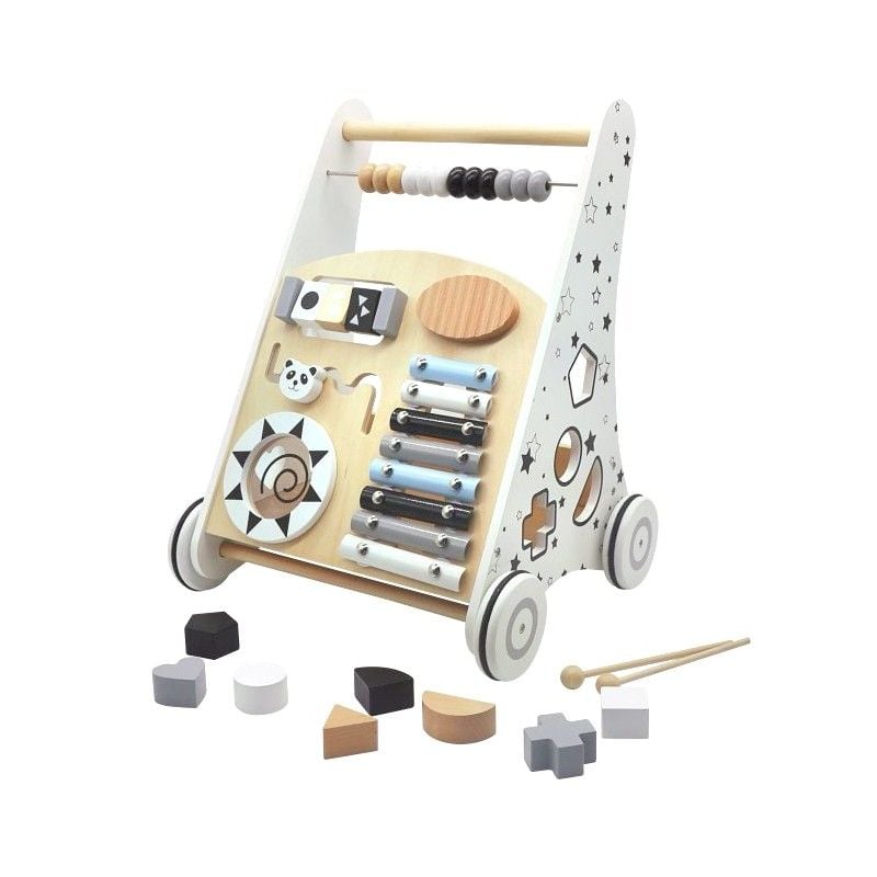 Premergator din lemn, xilofon, sortator forme, labirint, spatiu depozitare, 4 roti, 38x32x45.5 cm Premergatorul multifunctional este un produs ideal pentru dezvoltarea abilitatilor motrice si cognitive ale copiilor mici. Construit din lemn durabil si prietenos cu mediul, acest premergator ofera multiple activitati educative, precum un xilofon pentru dezvoltarea simtului muzical, un sortator de forme pentru stimularea coordonarii mana-ochi si un labirint captivant pentru antrenarea dexteritatii. De asemenea, include un spatiu de depozitare practic, ideal pentru a transporta jucariile preferate ale copilului. Designul atragator in culori pastelate face din acest premergator o piesa estetica potrivita pentru orice camera de copii. Echipat cu 4 roti stabile, asigura o manevrare usoara si sigura. Dimensiunile de 38x32x45.5 cm sunt perfecte pentru cei mici, iar greutatea maxima suportata este de 15 kg, asigurand o utilizare in siguranta. Acest premergator din lemn este un ajutor excelent pentru primii pasi ai copilului, incurajand explorarea si dezvoltarea abilitatilor esentiale intr-un mod distractiv si educativ. Ideal pentru copii cu varsta de peste 12 luni, produsul imbina educatia cu joaca intr-un mod creativ si interactiv. Specificatii: - premergator copii; - varsta recomandata 12 luni+; - multifunctional, cu multiple activitati; - prevazut cu xilofon, sortator forme, labirint, puzzle mobil, socotitoare; - dezvolta imaginatia si creativitatea, abilitatile sociale, motrice, gandirea logica, rezolvarea problemelor, etc; - spatiu de depozitare; - 4 roti; - maner impins si sustinere; - design minimalist, culori pastelate; - greutate maxima suportata 15 kg; - greutate produs 3,5 kg; - dimensiuni 38x32x45.5 cm; - material lemn; - multicolor. Avertizare! Produsul este nou si comercializat in ambalajul original al producatorului. Imaginile de pe site au caracter informativ. Nuanta, tonul si intensitatea culorii pot varia in functie de monitor. Continutul sau culorile specificate pot varia fata de fotografiile prezentate pe ambalaj. Ambalajul nu este o jucarie, acesta trebuie indepartat, recuperat si aruncat de catre un adult inainte de a se da spre utilizare copilului. Produsul poate fi ambalat in punga si necesita indepartarea ei din preajma copilului existand pericolul de sufocare. Se recomanda utilizarea produsului sub supravegherea unui adult. Produsul poate contine piese mici care se pot inghiti sau inhala de cei mici, existand pericolul de sufocare. In cazul inghitirii unor astfel de piese, consultati de urgenta un specialist. Pastrati piesele mici deformate, rupte sau dezasamblate departe de copii. Pastrati etichetele pentru referinte viitoare. Pastrati produsul departe de foc si nu il expuneti temperaturilor ridicate si umiditatii. Materialul din care este confectionat produsul este nedaunator sanatatii si nontoxic. Produs testat conform standardelor internationale. Nerecomandat copiilor cu varsta mai mica de 3 ani!
