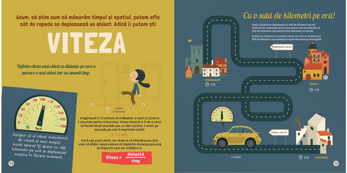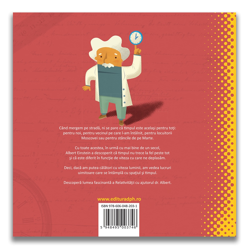 “Prima mea carte despre relativitate” este un fascinant ghid ilustrat despre relativitate și se adresează copiilor cu vârsta peste 10 ani. Teoria relativității a lui Albert Einstein este teoria spaţiului şi a timpului. Aşa că, pentru a putea înţelege teoria, trebuie mai întâi să înţelegem ce înseamnă aceste două concepte: spaţiu şi timp. Cu toţii avem o idee înnăscută despre SPAȚIU și TIMP şi, deşi pare că sunt concepte simple, vom vedea că, dacă stăm şi ne gândim puţin, constatăm că sunt lucruri fascinante. Încă din adolescență, Einstein se întreba de ce trebuia să se gândească el atât de mult la ceva care pentru ceilalţi era atât de uşor de înţeles. Datorită îndoielilor şi raționamentelor sale, câţiva ani mai târziu avea să conceapă una dintre cele mai importante teorii ale sale, teoria RELATIVITĂŢII speciale, teoria Spaţiu–Timp. Aşa că, primul lucru pe care-l vom face va fi să înţelegem ce sunt timpul, spaţiul şi mişcarea şi ce se întâmplă cu viteza luminii. Cu aceste ingrediente, la fel ca Einstein, vom fi în stare să înţelegem lumea prin intermediul RELATIVITĂŢII. Şi vom vedea că se întâmplă lucruri ce par de domeniul SF, dar care în realitate se petrec în universul nostru. Se spune că lui Einstein i-au trebuit vreo 10 ani ca să înţeleagă ideile teoriei RELATIVITĂŢII speciale pe care a conceput-o şi doar câteva săptămâni ca să găsească ecuaţiile matematice care o exprimă. Când mergem pe stradă, ni se pare că timpul este același pentru toată lumea: pentru noi, pentru vecinul cu care ne întâlnim, pentru locuitorii României sau pentru bolovanii de pe Marte. Dar acum mai bine de o sută de ani, Albert Einstein și-a dat seama că timpul nu trece la fel peste tot și că este diferit în funcție de viteza cu care călătorim. Deci, dacă am putea călători aproape cu viteza luminii, am vedea că se întâmplă lucruri incredibile cu spațiul și timpul. Nu este niciodată prea devreme să începi să explorezi idei grozave. Această lucrare „Prima mea carte despre relativitate” îi introduce pe copii în lumea fizicii prin ilustrații atrăgătoare și text amuzant. Așadar, din această lucrare scrisă pe înțelesul copiilor vei afla mai multe despre cum funcționează universul nostru și despre modul în care spațiul și timpul sunt conectate. Despre autor Sheddad Kaid-Salah Ferrón este un pasionat de știință și fizică, cu diplome în fizică și farmacie. Încă de la absolvire, a predat știința copiilor și a continuat să studieze fizica lucrând în domeniul farmaceutic și privind universul prin telescopul său. Acum scrie cărți depre științe. Eduard Altarriba locuiește în Moià, un oraș din apropierea Barcelonei. Este grafician și ilustrator și conduce “Alababalà”, un studio independent din Barcelona. Acesta produce jocuri, expoziții, animație, aplicații și cărți de lucru pentru copii, care sunt practice și distractive. Lucrează aproape de 15 ani în domeniile de ilustrații și design grafic, căutând mereu noi modalități de a înțelege comunicațiile grafice și de a dezvolta noi idei și proiecte. Specificații Vârstă: 8+ ani Pagini: 48 Mărimi: 28.5 x 28.5 cm Copertă: Cartonată