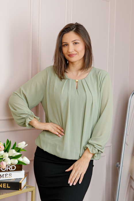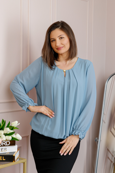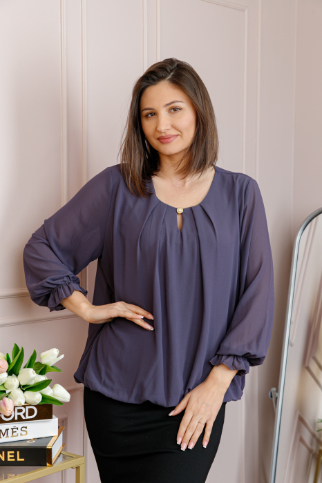Pulover din tricot subtire. Are guler rotund la baza gatului, croi lejer, usor cambrat si maneci lungi care se termina cu o banda lata. Aceeasi banda lata se regaseste si la baza puloverului, punand in evidenta zona taliei. Acest model de pulover poate...