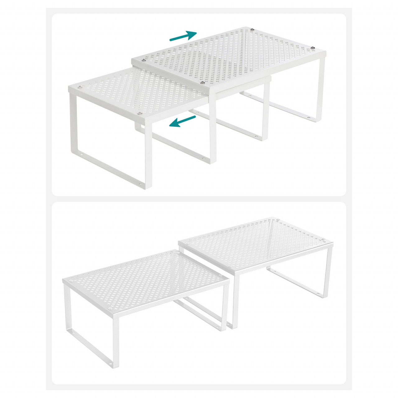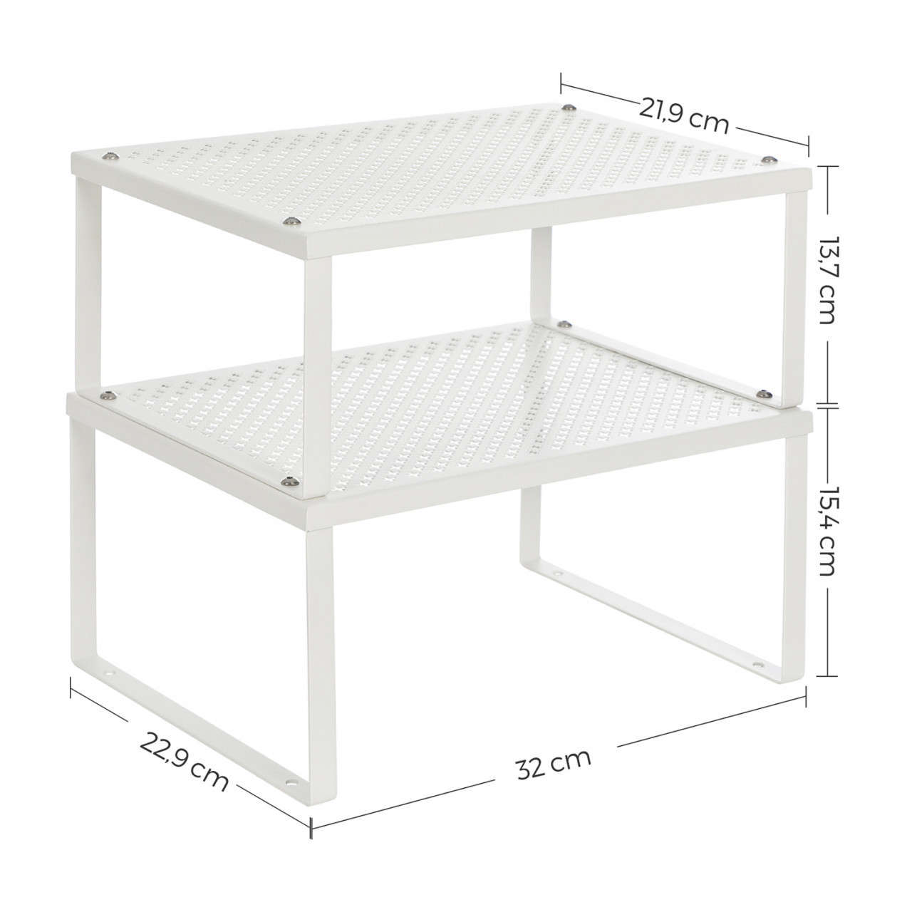 Pachetul Bundle Pack include: Doua seturi de doua rafturi pentru dulapuri de bucatarie, pentru a tine obiectele mici departe de contoarele de bucatarie sau ascunse, iar acum sunt organizate si usor de gasit Divide si cucereste: Aveti un dulap mare, dar condimentele si conservele dvs. nu au unde sa se duca? Incercati sa va impartiti spatiul din dulap cu aceste rafturi de dulap. Vedeti? Spatiul tau de depozitare este dublat Rafturi mici, putere uriasa: Desi sunt mici si au o structura simpla, rafturile metalice sunt suficient de puternice pentru a sustine pana la 22 lb fiecare; lasati-le pe ele uneltele de cafea sau presa de panini - se pot descurca. Stivuitor, extensibil: Asezati rafturile suprapuse, suprapuse, una langa alta sau in forma de L pentru a se potrivi spatiului dvs.; cu un design inteligent personalizabil, imaginatia dvs. este singurul factor limitativ Folositi metoda dumneavoastra: Sigur, aceste organizatoare de bucatarie au fost concepute pentru bucatarie. Dar ele pot fi folosite in camera de zi pentru jocuri, in birou pentru carti sau in garaj pentru unelte - depinde de tine