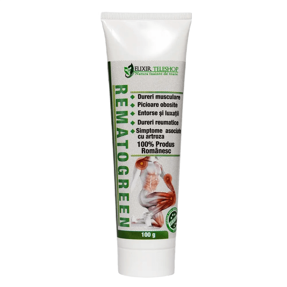 Rematogreen gel antireumaticActiunea terapeutica a gelului REMATOGREEN va va ajuta de fiecare data. Aplicati asupra zonei dureroase si masati usor. Imediat veti simti un flux de caldura si veti sti ca REMATOGREEN gel antireumatic actioneaza deja asupra zonei dureroase. Consistenta sa densa va face ca gelul sa fie cat mai mult timp in contact cu pielea. Fiind un produs inovator, va putea fi folosit ori de cate ori simtiti o durere./nREMATOGREEN gel lupta eficient impotriva durerilor reumatice, durerilor articulatiilor sau durerilor musculare, actionand si asupra circulatiei sangvine, imbunatatind-o. Cea mai buna alegere impotriva durerii, gelul inovator cu actiune imediata si rezultate simtitoare./nActioneaza doar asupra zonei dureroase iar efectul este de durata! Nu ezitati! Comandati acum gelul REMATOGREEN cu concentratie optima de substanta activa si consistenta densa pentru dureri reumatice, musculare sau dureri ale articulatiilor./nDescriere: Combinatie de substante de origine vegetala: extract de Lemn - dulce, uleiuri esentiale de Ienupar, Lavanda si mentol, care contribuie la calmarea si revitalizarea imediata a zonelor tensionate ale corpului :- dureri reumatice, musculare, in membre superioare si inferioare, spate, umeri, tample, scalp, ceafa- picioare obosite- entorse si luxatii- simptome asociate cu artroza./nMod de utilizare: Gelul se maseaza prin miscari circulare pe zona afectata, pana la absorbtia completa. Procedura se repeta, la nevoie, de 3 - 4 ori pe zi/nUleiul de masaj Tendoflexin se poate utiliza concomitent cu tratamentul pentru articulatii care contine extract de scoica verde, Tendoflexin capsule 1000mg„Da unui om sanatate si un tel de urmat si nu se va opri o clipa sa se intrebe daca este fericit sau nu”./nAcesta este un produs VAZUT LA TV