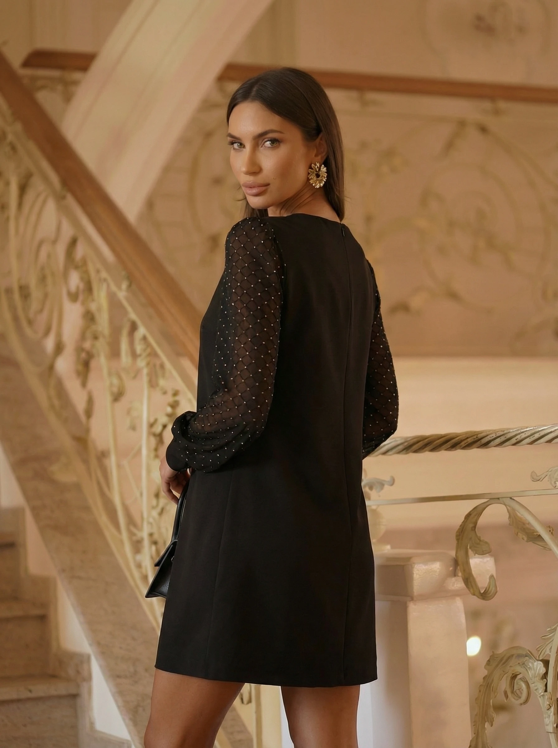 Rochie neagra scurtă cu mâneci din tull brodat cu un design modern și elegant, perfectă pentru femeile care adoră ținutele rafinate. Materialul fin oferă o cădere plăcută, iar mânecile din tull brodat adaugă un aer sofisticat și feminin. Croiul lejer avan