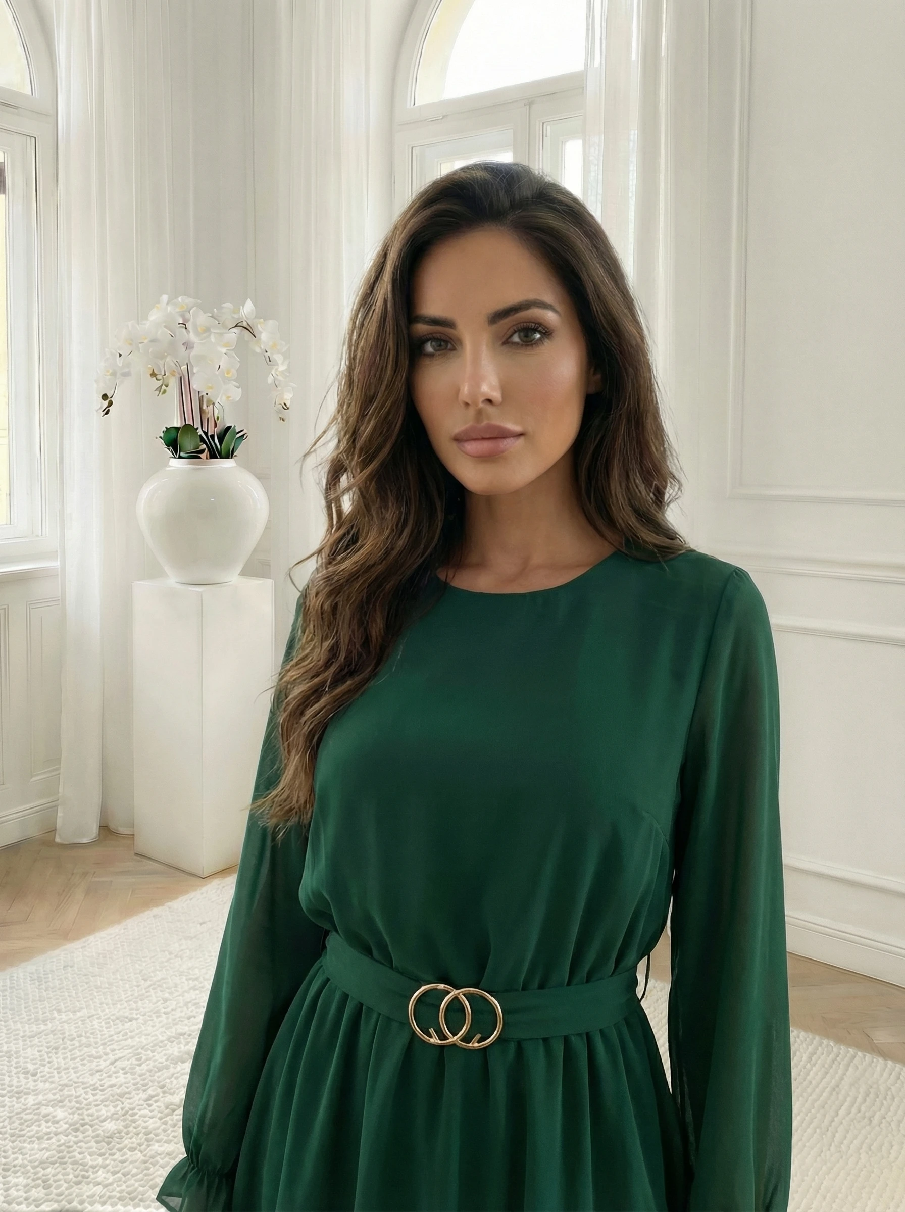 Rochie verde eleganta scurta cu volane si curea in talie, perfecta pentru aparitii feminine si stilate. Croiul lejer este completat de o curea in talie ce evidentiaza silueta, oferind un look echilibrat si modern. Manecile lungi, usor transparente, adauga