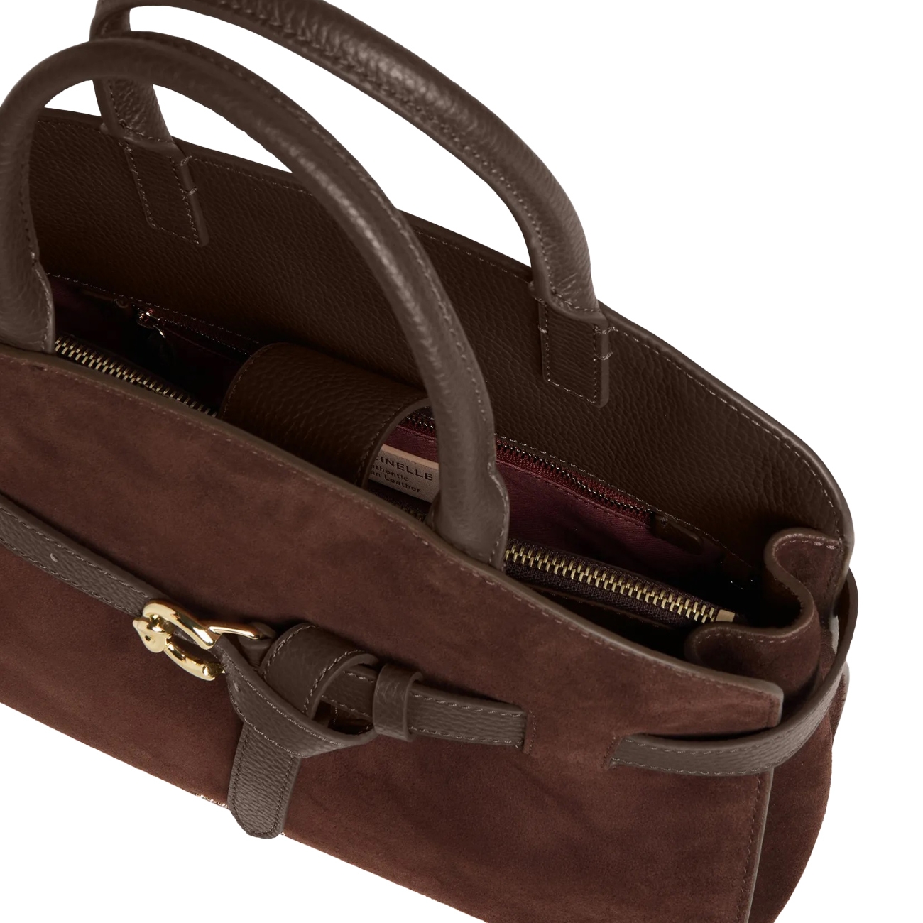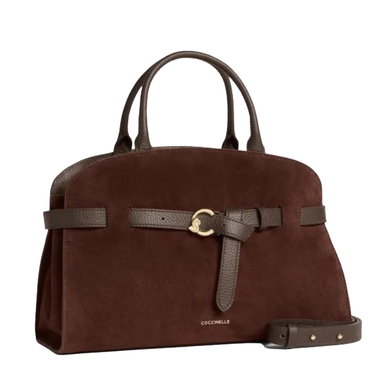 Geanta Sabine de la Coccinelle reinterpretează eleganța clasică printr-un joc rafinat de contraste între structură și finețe. Realizată din piele întoarsă moale, cu detalii din piele netedă, emană un aer sofisticat și contemporan. Detaliul centurii frontale cu logo-ul C-Me adaugă o notă distinctivă, definind stilul elegant al brandului. Poate fi purtată în mână sau pe umăr, datorită curelei lungi, reglabile și detașabile, fiind ideală pentru o eleganță discretă de zi cu zi. Interiorul este bine organizat, cu compartimente multiple, inclusiv un buzunar cu fermoar, iar finisajele Light Gold și logo-ul metalic Coccinelle completează perfect designul.