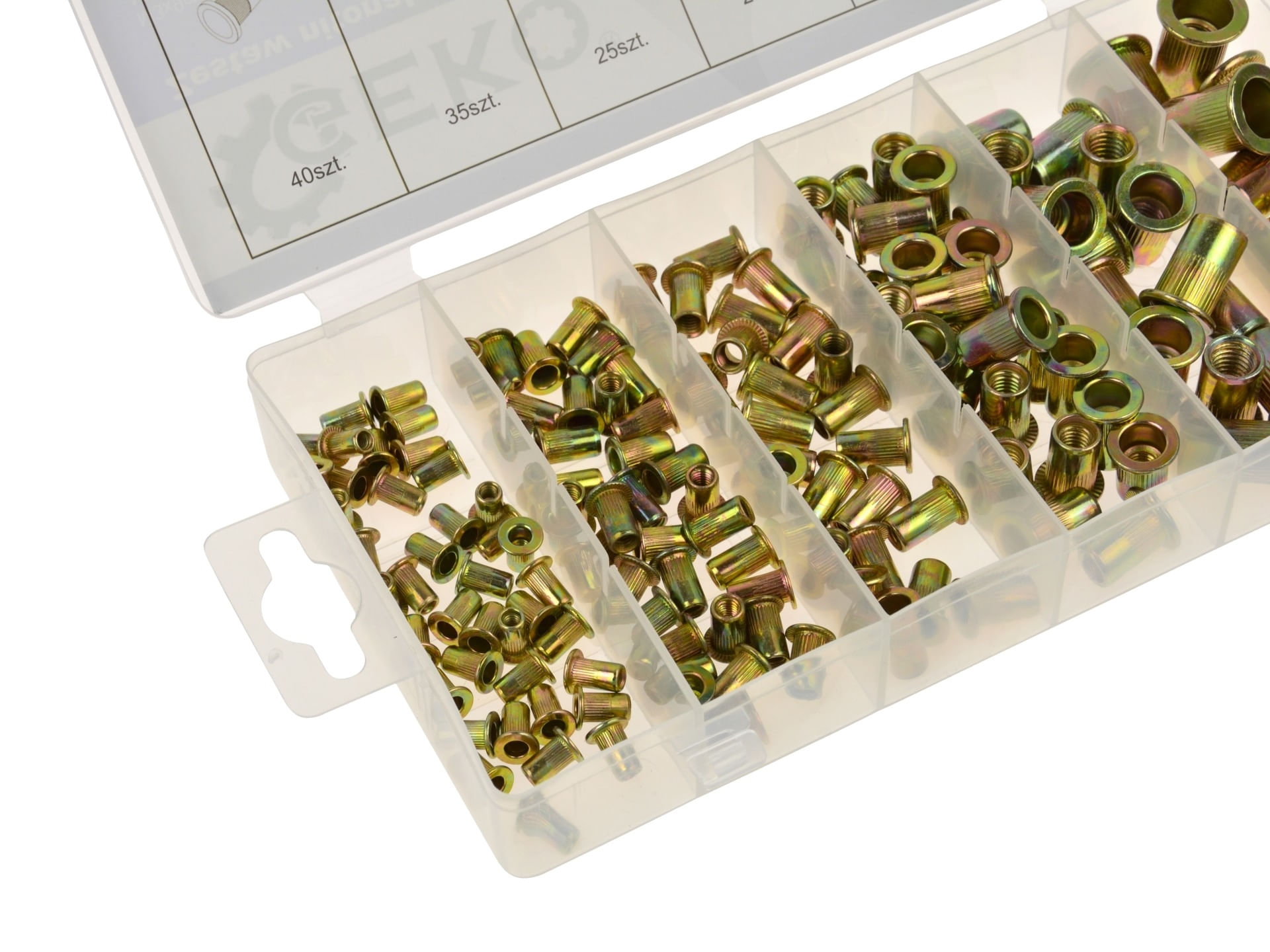 Continutul pachetului Piulita din nit din otel 40x M3x9 mm Piulita din otel de otel 35x M4x11 mm Piulita din nit din otel 25x M5x13 mm Piulita din otel de otel 25x M6x15 mm Piulita din otel de otel 15x M8x18 mm Piulita din otel 10x M10x21 mm