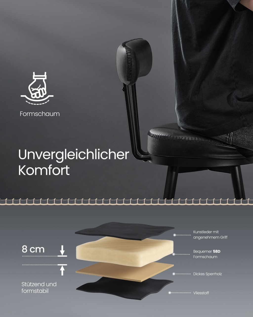 Acest scaun de bar din colecția VASAGLE EKHO este finisat cu piele ecologică bogat texturată, iar cusăturile fine evidențiază măiestria, creând un cămin care spune multe despre stilul tău. Confort de fiecare dată când te așezi: Trece-ți mâna peste suprafața netedă și afundă-te în spuma turnată de 58D, cu grosimea de 8 cm. Aceste scaune de bar oferă o experiență de ședere confortabilă, care va rezista în timp. Stabil și prietenos cu podeaua: Picioarele metalice orientate spre exterior, care formează o bază extrem de solidă, împreună cu picioarele reglabile universale, nu doar oferă acestor scaune o stabilitate ridicată pe podele denivelate, ci și protejează podeaua de zgârieturi. [Sezut rotativ, interacțiune liberă] Scaunele de bar cu rotație de 360° se rotesc liber pentru a intra ușor în contact cu toți cei din jur. Astfel, fiecare moment social – fie în bucătărie, barul de acasă sau camera de divertisment – devine memorabil! [Îngrijire ușoară, eleganță de durată] S-a vărsat ceva? Nicio problemă! Husa noastră impermeabilă din piele ecologică face curățarea foarte ușoară. Împreună cu picioarele din oțel mat, rezistent la zgârieturi, scaunele își păstrează farmecul de înaltă calitate pentru mult timp. Specificații: Culoare: negru cerneală Material: oțel, spumă turnată 58D, piele sintetică PU (poliuretan), placaj Dimensiunile fiecărui scaun: 54 x 54 x 91 cm (D x l x H) Înălțimea șezutului: 65 cm Greutate totală: 13,6 kg Încărcare statică maximă per scaun: 120 kg Conținutul pachetului: 2 x scaune de bar 1 x set de accesorii 1 x manual