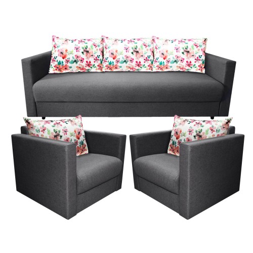Setul 3+1+1 Croma este alcatuit dintr-o canapea cu 3 locuri si 2 fotolii fixe. Canapeaua Croma este o canapea moderna conceputa pentru un stil de viata activ fiind foarte usor de extins si de strans. Canapeaua Croma cu 3 locuri are brate inguste pentru o incadrare cat mai eficienta in camera pastrand suprafata generoasa de dormit atunci cand este extinsa. Canapeaua Croma este extensibila putand fi utilizata zilnic atat ca si canapea pentru petrecerea timpului liber cat si ca un pat generos pe timpul noptii. Suprafata de dormit este 140 * 190 cm. Canapeaua Croma are saltele cu plasa de arcuri (tip Relaxa) si burete de densitate mare pentru o rezistenta sporita in timp, iar datorita suprafetei plane care se formeaza atunci cand se extinde asigura un somn odihnitor pe timpul noptii. Atat canapeaua cat si pernele sunt tapitate cu stofa. Canapeaua Croma are o lada de depozitare generoasa foarte practica atat pentru lenjeria de pat, cat si pentru diverse obiecte pe care le folositi rar. Sezutul in varianta stransa are o latime generoasa de 70 cm si poate fi folosit de o persoana in timpul zilei pentru un pui de somn fara a mai fi nevoie sa extindeti canapeaua. Canapeaua Croma are 3 perne pufoase foarte utile pentru o sedere cat mai confortabila pe canapea, dar si pentru o pata de culoare. Canapeaua Croma este foarte usor de montat avand elemente de cuplare rapide. Canapeaua Croma este prevazuta cu un peretar prins intre brate care ramane la perete atunci cand canapeaua este extinsa si este folosita pentru dormit. Peretarul protejeaza peretele si asigura un confort sporit pentru persoana care va dormi la perete. Dimensiuni canapea Croma stransa: Lungime: 2110 mm Adancime: 990 mm Inaltime: 710 mm Suprafata de dormitor canapea Croma: 1400 x 1900 mm Fotoliul Croma este un fotoliu modern conceput pentru un stil de viata activ. Fotoliul Croma are saltea cu plasa de arcuri (tip Relaxa) si burete de densitate mare pentru o rezistenta sporita in timp. Atat fotoliul cat si perna sunt tapitate cu stofa. Fotoliul Croma are o perna pufoasa foarte utila pentru o sedere cat mai confortabila pe fotoliu, dar si pentru o pata de culoare. Fotoliul Croma este foarte usor de montat avand elemente de cuplare rapide. Dimensiuni fotoliu Croma: Lungime: 860 mm Adancime: 780 mm Inaltime: 700 mm