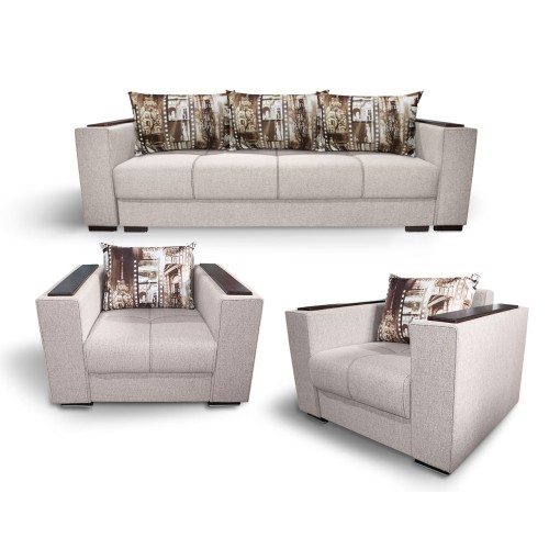 Setul 3+1+1 Solis este alcatuit dintr-o canapea cu 3 locuri si 2 fotolii fixe. Canapeaua Solis este o canapea moderna conceputa pentru un stil de viata activ fiind foarte usor de extins si de strans. Canapeaua Solis este extensibila putand fi utilizata zilnic atat ca si canapea pentru petrecerea timpului liber cat si ca un pat generos pe timpul noptii. Suprafata de dormit este 140 * 190 cm. Canapeaua Solis are saltele cu plasa de arcuri (tip Relaxa) si burete de densitate mare pentru o rezistenta sporita in timp, iar datorita suprafetei plane care se formeaza atunci cand se extinde asigura un somn odihnitor pe timpul noptii. Atat canapeaua cat si pernele sunt tapitate cu stofa. Canapeaua Solis are o lada de depozitare generoasa foarte practica atat pentru lenjeria de pat, cat si pentru diverse obiecte pe care le folositi rar. Sezutul in varianta stransa are o latime generoasa de 70 cm si poate fi folosit de o persoana in timpul zilei pentru un pui de somn fara a mai fi nevoie sa extindeti canapeaua. Canapeaua Solis are 3 perne pufoase foarte utile pentru o sedere cat mai confortabila pe canapea, dar si pentru o pata de culoare. Canapeaua Solis este foarte usor de montat avand elemente de cuplare rapide. Canapeaua Solis este prevazuta cu un peretar prins intre brate care ramane la perete atunci cand canapeaua este extinsa si este folosita pentru dormit. Peretarul protejeaza peretele si asigura un confort sporit pentru persoana care va dormi la perete. Cusaturile de pe sezutul canapelei dau o eleganta aparte canapelei Solis. Pe bratele canapelei se afla ornamente din MDF wenge care pot fi folosite ca suport pentru pahare. Dimensiuni canapea Solis stransa: Lungime: 2320 mm Adancime: 990 mm Inaltime: 710 mm Suprafata de dormitor canapea Solis: 1400 x 1900 mm Fotoliul Solis este un fotoliu modern conceput pentru un stil de viata activ. Fotoliul Solis are saltea cu plasa de arcuri (tip Relaxa) si burete de densitate mare pentru o rezistenta sporita in timp. Atat fotoliul cat si perna sunt tapitate cu stofa. Fotoliul Solis are o perna pufoasa foarte utila pentru o sedere cat mai confortabila pe fotoliu, dar si pentru o pata de culoare. Cusaturile de pe sezutul fotoliului dau o eleganta aparte produsului. Pe bratele fotoliului se afla ornamente din MDF wenge care pot fi folosite ca suport pentru pahare. Fotoliul Solis este foarte usor de montat avand elemente de cuplare rapide. Dimensiuni fotoliu Solis: Lungime: 1080 mm Adancime: 860 mm Inaltime: 730 mm