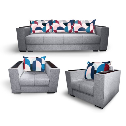 Setul 3+1+1 Solis este alcatuit dintr-o canapea cu 3 locuri si 2 fotolii fixe. Canapeaua Solis este o canapea moderna conceputa pentru un stil de viata activ fiind foarte usor de extins si de strans. Canapeaua Solis este extensibila putand fi utilizata zilnic atat ca si canapea pentru petrecerea timpului liber cat si ca un pat generos pe timpul noptii. Suprafata de dormit este 140 * 190 cm. Canapeaua Solis are saltele cu plasa de arcuri (tip Relaxa) si burete de densitate mare pentru o rezistenta sporita in timp, iar datorita suprafetei plane care se formeaza atunci cand se extinde asigura un somn odihnitor pe timpul noptii. Atat canapeaua cat si pernele sunt tapitate cu stofa. Canapeaua Solis are o lada de depozitare generoasa foarte practica atat pentru lenjeria de pat, cat si pentru diverse obiecte pe care le folositi rar. Sezutul in varianta stransa are o latime generoasa de 70 cm si poate fi folosit de o persoana in timpul zilei pentru un pui de somn fara a mai fi nevoie sa extindeti canapeaua. Canapeaua Solis are 3 perne pufoase foarte utile pentru o sedere cat mai confortabila pe canapea, dar si pentru o pata de culoare. Canapeaua Solis este foarte usor de montat avand elemente de cuplare rapide. Canapeaua Solis este prevazuta cu un peretar prins intre brate care ramane la perete atunci cand canapeaua este extinsa si este folosita pentru dormit. Peretarul protejeaza peretele si asigura un confort sporit pentru persoana care va dormi la perete. Cusaturile de pe sezutul canapelei dau o eleganta aparte canapelei Solis. Pe bratele canapelei se afla ornamente din MDF wenge care pot fi folosite ca suport pentru pahare. Dimensiuni canapea Solis stransa: Lungime: 2320 mm Adancime: 990 mm Inaltime: 710 mm Suprafata de dormitor canapea Solis: 1400 x 1900 mm Fotoliul Solis este un fotoliu modern conceput pentru un stil de viata activ. Fotoliul Solis are saltea cu plasa de arcuri (tip Relaxa) si burete de densitate mare pentru o rezistenta sporita in timp. Atat fotoliul cat si perna sunt tapitate cu stofa. Fotoliul Solis are o perna pufoasa foarte utila pentru o sedere cat mai confortabila pe fotoliu, dar si pentru o pata de culoare. Cusaturile de pe sezutul fotoliului dau o eleganta aparte produsului. Pe bratele fotoliului se afla ornamente din MDF wenge care pot fi folosite ca suport pentru pahare. Fotoliul Solis este foarte usor de montat avand elemente de cuplare rapide. Dimensiuni fotoliu Solis: Lungime: 1080 mm Adancime: 860 mm Inaltime: 730 mm