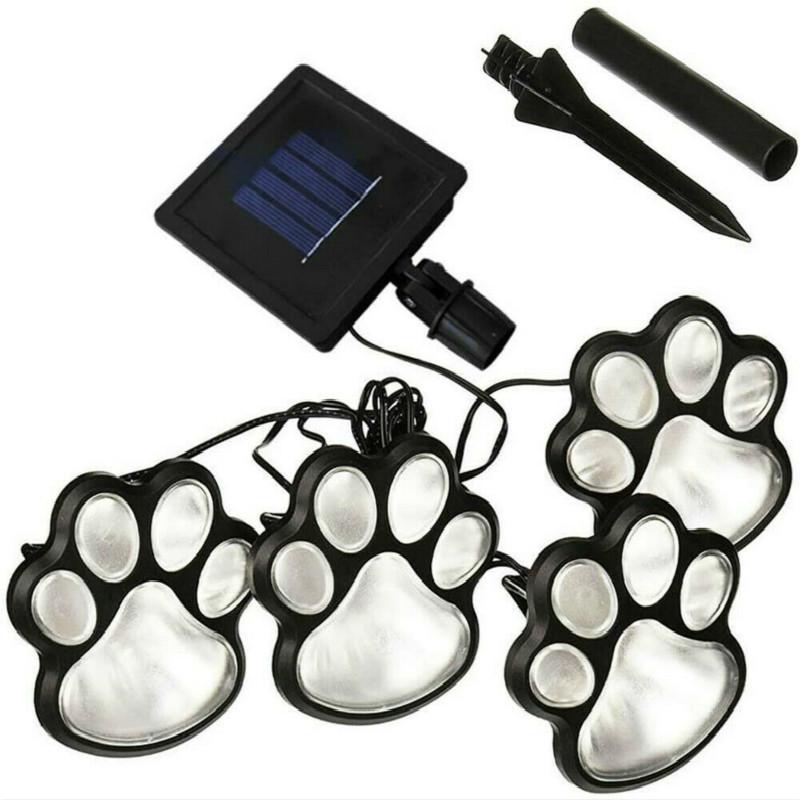 Set 4 lampi solare Paw Print Light Si tu esti un iubitor al patrupezilor? Ofera un decor creativ si amuzant gradinii tale cu acest set de lampi tip amprente de catel, iluminate cu LED-uri solare! Cele 4 amprente pot fi aranjate si fixate in mod arbitrar cu ajutorul tepuselor de fixare. Decor creativ - lumina fiecarei labute va adauga un ton ambiental placut atmosferei din gradina. Poti sa le asezi de-a lungul unei carari in scop de infrumusetare, dar si din motive de siguranta pe timpul noptii. Foarte usor de instalat - le iei direct din cutie si le instalezi, fara a fi nevoie de cabluri care sa te incurce. Functionare pe bazxa de lumina solara - luminile pornesc atunci cand apune soarele si se opresc la rasarit. Vei economisi bani cu electricitatea, deoarece acumulatorul reincarcabil al lampilor isi ia toata energia de la soare. Rezistente la orice tip de vreme - Datorita carcasei din plastic rezistent nu va mai trebui sa iti faci griji cu privire la vremea schimbatoare. Carcasa protejeaza lampa de stropii de apa, zapada, gheata sau lapovita, ceea ce inseamna ca va avea o durata de viata lunga, iar tu nu vei fi nevoit sa le tot schimbi. Caracteristici generale: Material: Plastic Nr. LED-uri: 4 buc. LED Culoare LED: Alb cald Panou solar: 2 V, 45 mA Sursa de energie: 1 Acumulator de tip AA 1,2 V Capacitate acumulator: 300 mAh Lungimea totala a cablului: 360 cm (4 x 90 cm) Dimensiune amprente: 90 x 88 x 85 mm Lungime tepusa de fixare: 42 mm Dimensiunile unitatii solare: 76 x 50 x 25 mm Lungimea tepusei de fixare a unitatii solare: 170 mm Masa: 250 g Intrerupator: ON/ OFF.