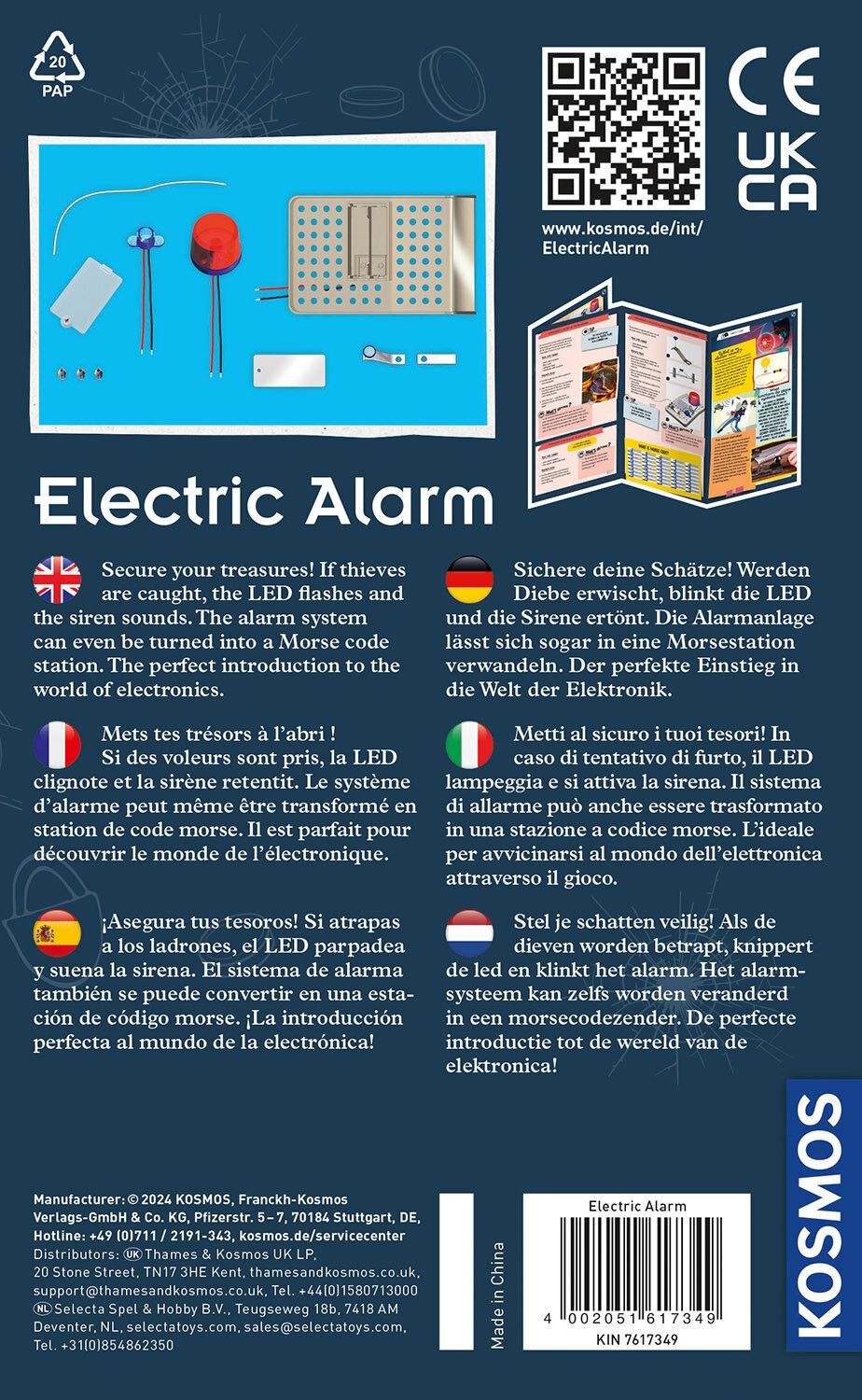 Set educativ - Alarma electricaSetul experimental Alarma electronica de la brandul KOSMOS este o jucarie educativa care capteaza dependenta, conceputa pentru copii cu varste intre 8-12 ani, care iti permite sa construiesti si sa personalizi un adevarat sistem de alarma. Asamblarea este simpla, iar datorita instructiunilor detaliate, copiii pot crea pas cu pas un sistem de placi de baza cu o sirena si o lumina de avertizare. Aceasta este o siguranta perfecta pentru secrete - orice oaspete neinvitat care incearca sa caute in „ascunzatoarea secreta” va fi imediat alertat! Produsul nu ofera doar divertisment, ci ii introduce si pe tinerii inventatori in lumea electronicii si la elementele de baza ale circuitelor electrice. Prin experimente simple, copiii invata cum functioneaza sistemele electrice si cum sa le construiasca. Setul are si o functie suplimentara care cu siguranta va starni curiozitatea – sistemul de alarma poate fi usor transformat intr-un dispozitiv pentru trimiterea de mesaje folosind codul Morse. Acesta este un mod fascinant de a invata elementele de baza ale acestui alfabet si cum poate fi folosit. Instructiuni clare, ilustrate pas cu pas, va ghideaza copilul prin procesul de creare a unei alarme, inspirand experimente si invatare ulterioare. Fiecare pas de asamblare este explicat clar, astfel incat chiar si copiii mai mici isi pot construi propria alarma. In plus, brosura contine fapte interesante care explica cum functioneaza electricitatea si principiile comunicarii Morse. Setul Electro Alarm este o combinatie de distractie si invatare, perfect ca cadou de ziua de nastere sau ca suvenir creativ. Datorita acesteia, copiii nu numai ca isi creeaza propria alarma, ci invata si independenta, gandirea logica si elementele de baza ale ingineriei. Produsul este sigur, iar componentele folosite sunt adaptate mainilor si abilitatilor manuale ale copiilor. Elektro Alarm de la KOSMOS este un set care dezvolta cunostinte tehnice si stiintifice, precum si trezeste pasiunea pentru descoperirea de noi tehnologii. Copiii invata prin joaca si in acelasi timp isi dezvolta abilitati utile in viata de zi cu zi.
