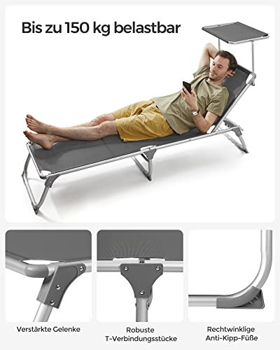 LOUNGE CU ELEGANTA: Un sezlong excelent proiectat pentru toti; utilizati-l ca un scaun de bronzare perfect, un loc de relaxare sau de lectura la domiciliu, gradina, terasa sau piscina; sau pur si simplu transportati-l la urmatoarea excursie pe plaja sau camping; designul modern si inovator il face un ochi-catcher PRACTIC, Usor, ROBUST: Ocupa putin spatiu pentru depozitare; cadrul din aluminiu rezistent la rugina si rezistent la rugina ii prelungeste durata de viata; cantareste doar 6,6 kg si poate fi transportat cu usurinta cu manerul incorporat Construit pentru a rezista: Suprafata acestui fotoliu este realizata din tesatura sintetica premium, care este respirabila, rezistenta la UV si umiditate si, de asemenea, foarte usor de curatat. FLEXIBILITATE SUPERIOARA: 5 pozitii de inclinare pentru spatarul reglabil si perna detasabila pentru preferintele dvs.; reglati umbrela de soare la orice unghi de care aveti nevoie, astfel incat sa va puteti bucura de soare oricand fara arsuri solare Picioare anti-alunecare: Datorita picioarelor anti-alunecare, acest scaun de lounge in aer liber va ramane perfect nemiscat pe orice podea sau sol; fitingurile de siguranta de la 4 colturi pot fi blocate dupa ce scaunul este configurat; serviciul excelent pentru clienti garanteaza o satisfactie de 100%.