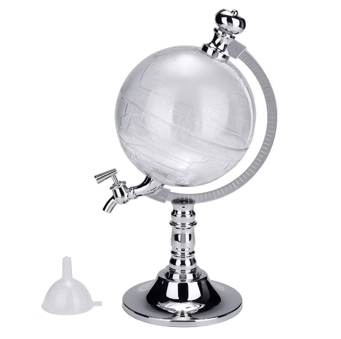 Dozator pentru bauturi in forma de Glob Pamantesc poate fi folosit pentru orice tip de bauturi,cum ar fi : whisky, bere, vin, sucuri, apa,..etc. Caracteristici: - este o idee perfecta pentru un Cadou sau pentru decorarea casei sau a biroului dumnevoastra. - dozator pentru bauturi diverse cu forma originala unui glob pamantesc - fabricat din PMMA (fara BPA) - design original si practic - cu continente detaliate pe glob - buton de turnare usor pornit / oprit - stand de sustinere argint - usor de folosit si de manevrat - usor de folosit: se umple in partea de sus, iar de la maneta de jos, se poate servi - va face impresie cu siguranta, cand veti da o petrecere - poate fi folosit pentru orice tip de bauturi - realizat din material plastic cu sticla rezistent si de calitate