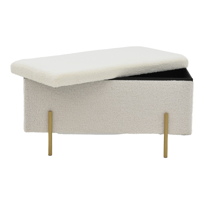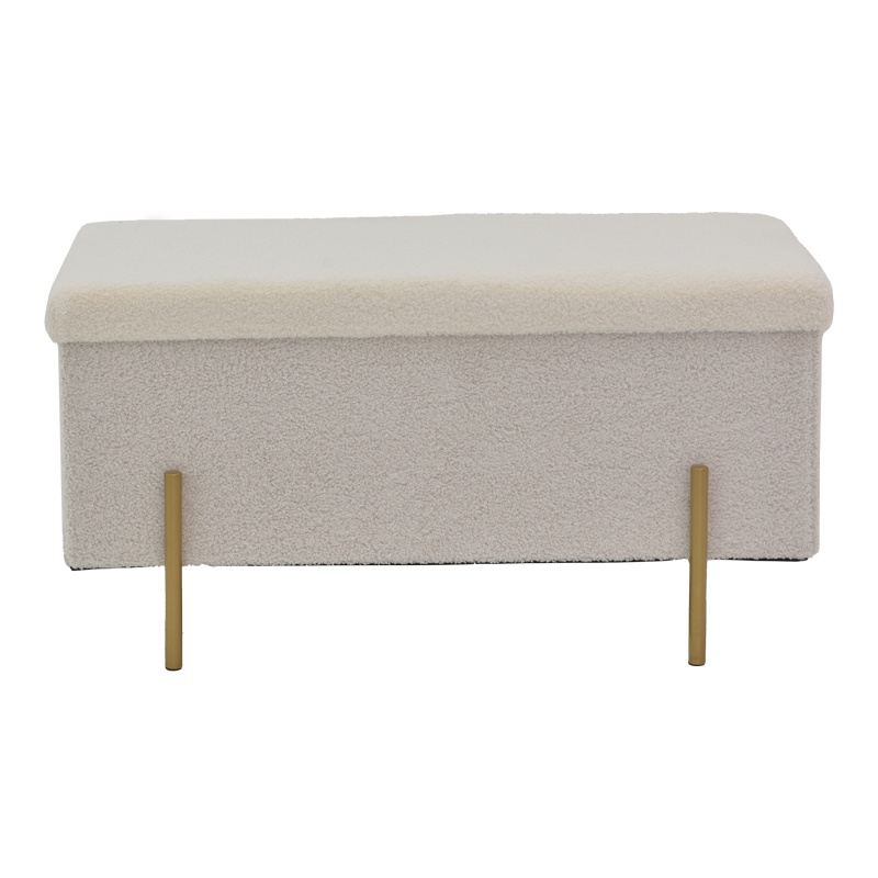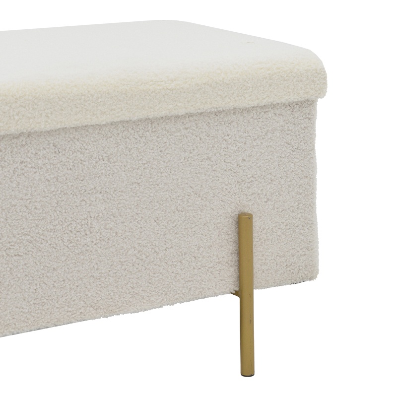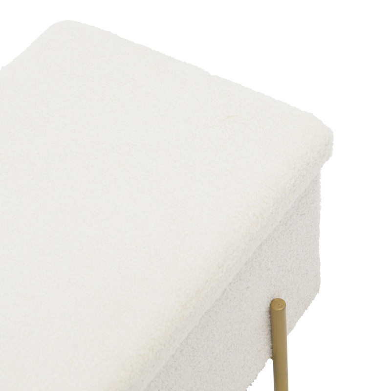 Taburet Ziwel, alb/auriu, 80x40x40 cm Descoperă eleganța și funcționalitatea cu taburetul Ziwel, un element de design care îmbină perfect stilul modern cu utilitatea practică. Ideal pentru orice spațiu din locuința ta, acest taburet nu doar că adaugă un plus de rafinament, dar oferă și un spațiu de depozitare discret. Caracteristici principale Taburetul Ziwel se remarcă prin designul său simplu și sofisticat, fiind alegerea perfectă pentru cei care doresc să îmbunătățească decorul casei lor. Cu o combinație de culori alb și auriu, acest taburet aduce un aer de lux și modernitate în orice încăpere. Specificații tehnice Material: MDF de înaltă calitate și spumă durabilă. Finisaj: Tapițerie din material bouclé de calitate superioară, în nuanță albă. Spațiu de depozitare: Include un compartiment pentru depozitarea obiectelor personale. Suport: Patru picioare metalice rezistente, de culoare aurie. Dimensiuni: Lungime 80 cm, lățime 40 cm, înălțime 40 cm. Utilizare și întreținere Taburetul Ziwel este livrat ambalat din fabrică, asigurându-se astfel că ajunge în condiții optime la tine acasă. Pentru a păstra aspectul său impecabil, se recomandă curățarea regulată a suprafeței cu o cârpă moale și evitarea expunerii prelungite la soare pentru a preveni decolorarea. Cu taburetul Ziwel, aduci un plus de stil și funcționalitate în casa ta, fiind o piesă de mobilier care se potrivește perfect atât în living, cât și în dormitor sau birou.