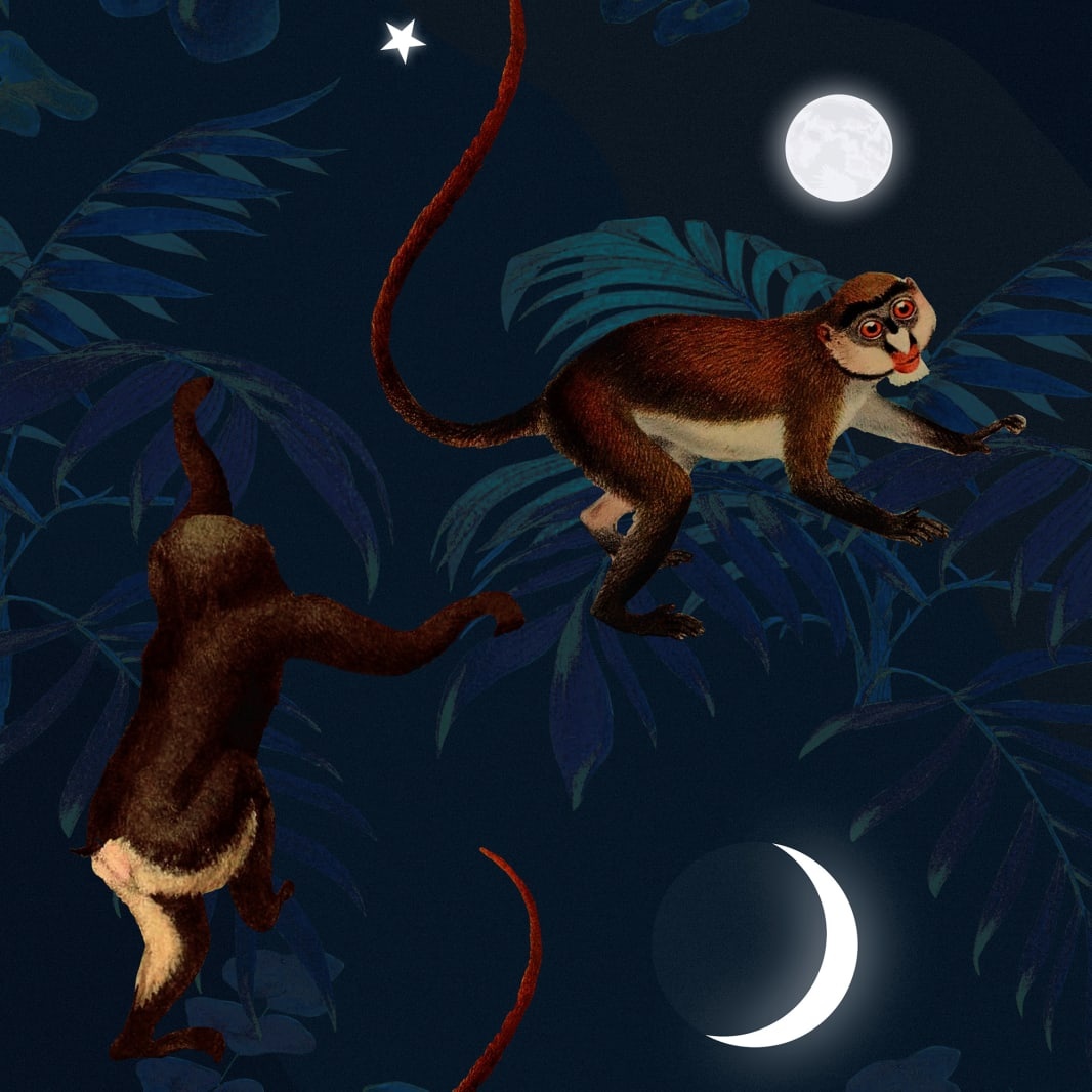E lună plină sau doar pe jumătate? Oare stelele strălucesc în mod special mai tare pe cerul nopții târzii sau fac opusul - cad? În cazul acesta, nu uita să-ți pui o dorință. Maimuțele se cațără cu flexibilitate în sus și-n jos pe plante și blana lor lucitoare duce la un contrast frumos cu fundalul adânc de albastru închis.