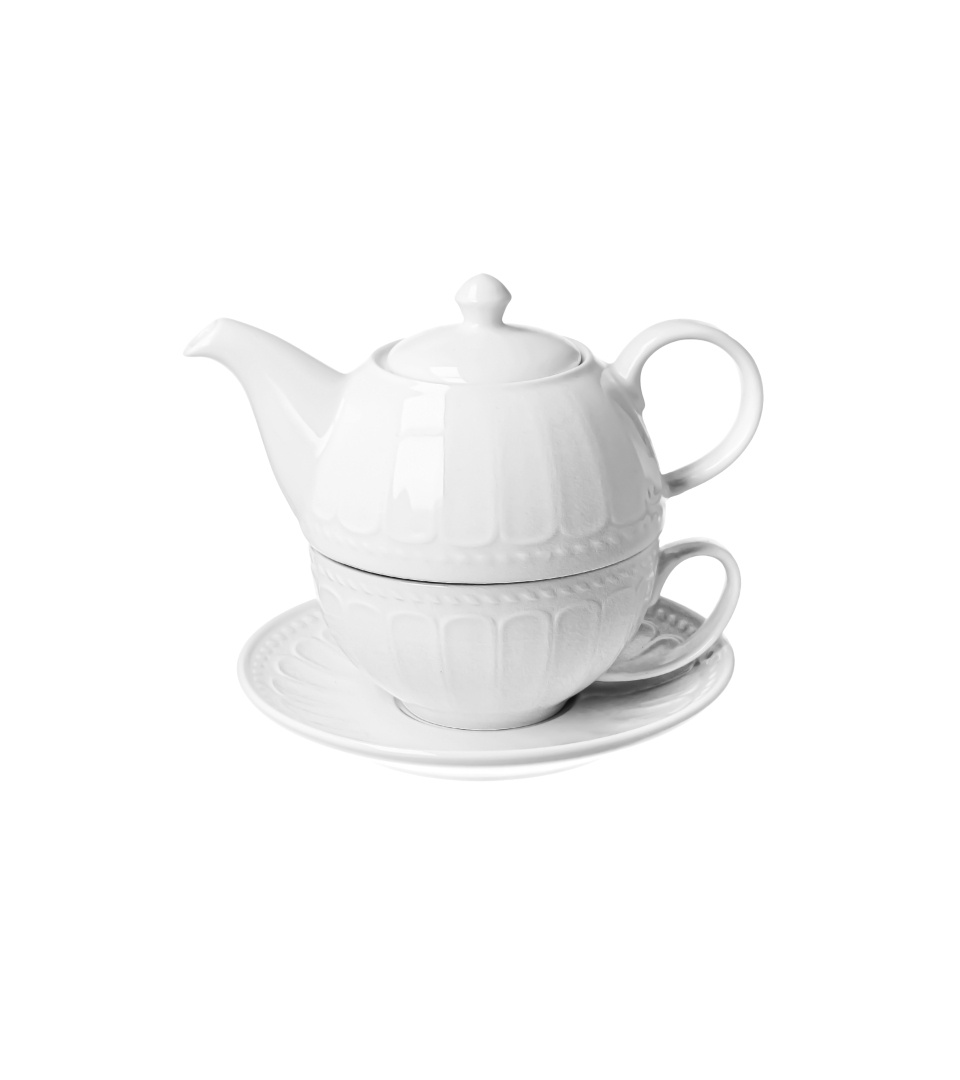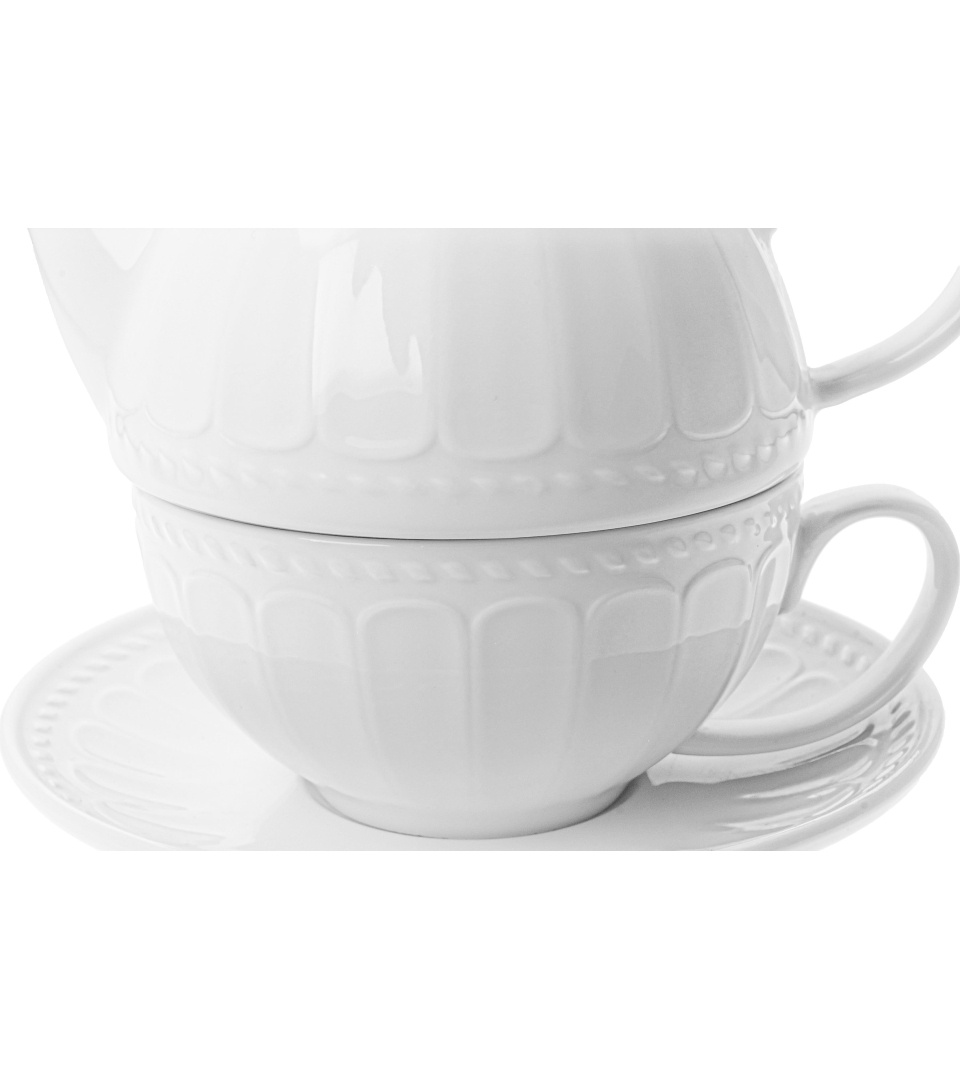 Acest set Tea for One din portelan este conceput pentru cei care prefera sa isi prepare si sa isi serveasca ceaiul intr-un format individual, ordonat si usor de folosit. Setul include un ceainic de 550ml cu capac, o ceasca de 300ml si o farfurioara, asezate intr-o compozitie compacta care economiseste spatiu si aduce toate piesele necesare intr-un singur ansamblu. Ceainicul se aseaza direct peste ceasca, iar farfurioara completeaza setul pentru o servire curata si practica. Este un tip de accesoriu pentru ceai potrivit pentru acasa, pentru birou sau pentru acele momente in care vrei sa iti pregatesti ceaiul fara sa folosesti mai multe obiecte separate. Dupa infuzare, ceaiul poate fi turnat direct in ceasca din set, ceea ce face utilizarea simpla si fireasca. In cautari online, produsul se potriveste natural in categorii precum tea for one, set ceai din portelan, ceainic cu ceasca si farfurioara sau set pentru servirea ceaiului. Modelul TWILIGHT este definit vizual prin suprafata alba si relieful decorativ format din panouri verticale rotunjite, completate de o bordura discreta in zona de mijloc. Acest detaliu ii da textura si personalitate fara sa incarce forma. Aspectul general este curat, echilibrat si usor de integrat atat intr-un decor clasic simplificat, cat si intr-un context mai modern. Este un produs potrivit pentru cei care apreciaza obiectele functionale, dar bine rezolvate vizual. Faptul ca apare si in cutie il face usor de prezentat si de oferit mai departe, insa argumentul principal ramane utilizarea lui clara: un set compact din portelan, pentru ceai servit individual, cu un design alb, discret texturat.