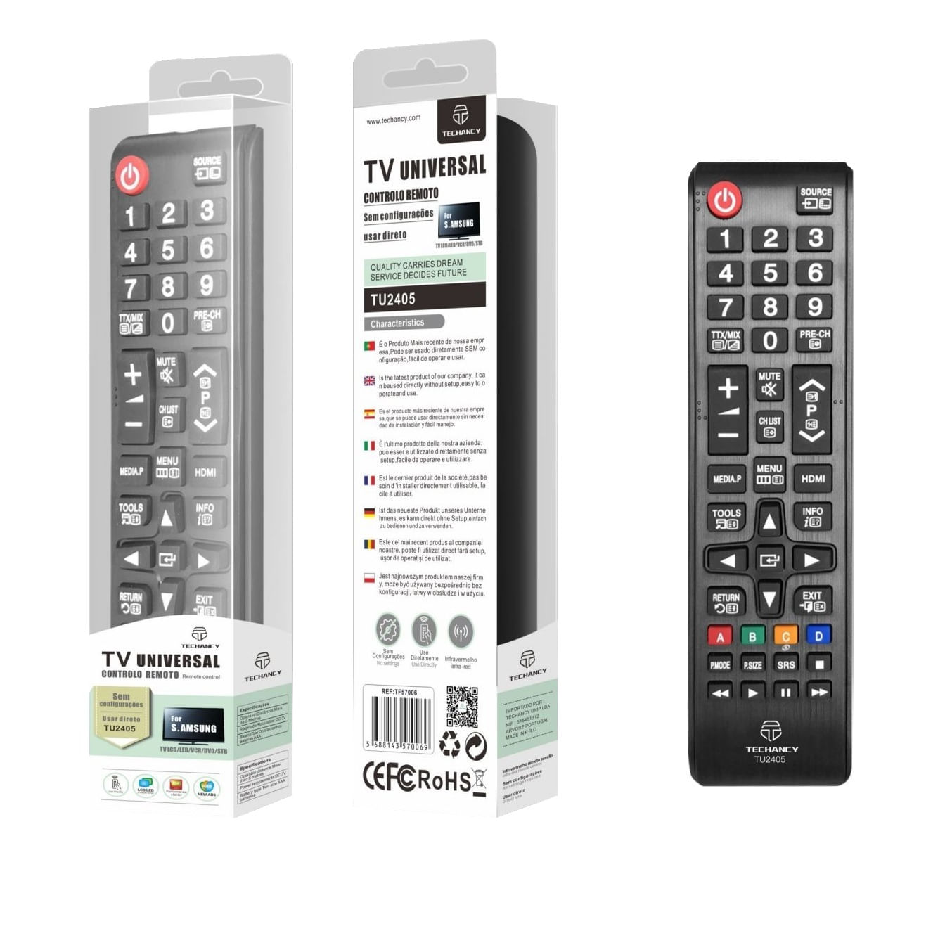 Telecomanda Universala pentru TV Samsung Telecomanda este recomandata pentru televizoarele Smasung. Nu necesita configurare, dupa achizitie trebuie doar alimentata cu 2 baterii AAA si poate fi utilizata. Este realizata din plastic rezistent cu butoane din cauciuc moale, ce permite o apasare usoara. Caracteristici: - telecomanda pentru televizoare Samsung; - este precodata, nu necesita cod de configurare; - este alimentata de 2 baterii AAA(neincluse); - realizata din plastic rezistent cu butoane cauciucate; - culoare neagra.