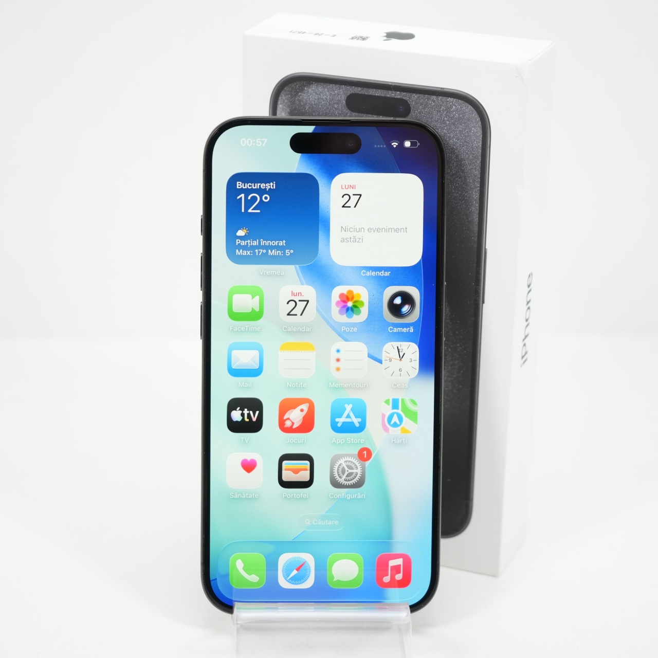 Ecran: 6.1, Refresh Rate 120 Hz Procesor: Apple A17 Pro Memorie RAM: 8 GB Memorie interna: 256GB Camera Foto: Principala 48 MPx, Frontala 12 MPx Stare retea: Liber de rețea