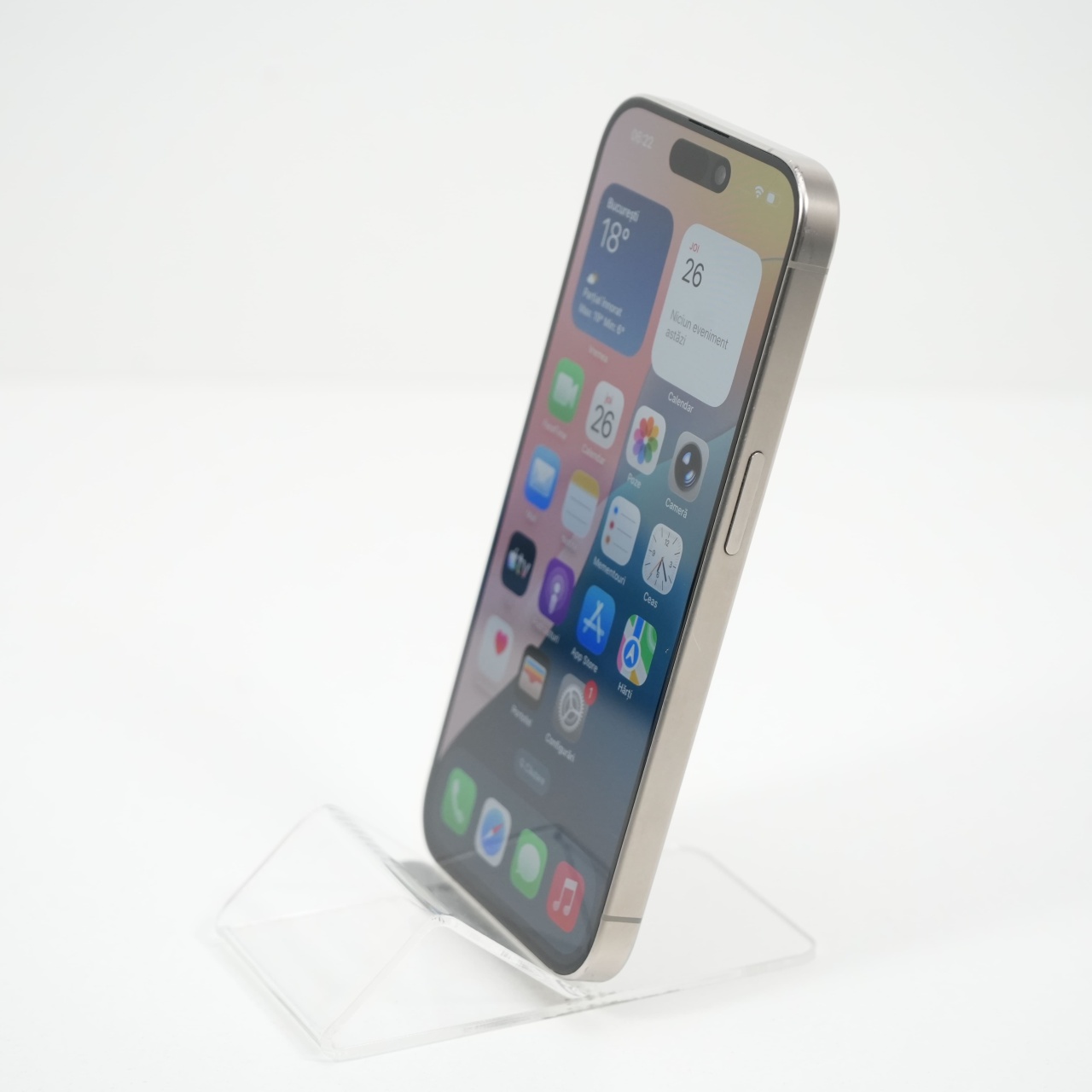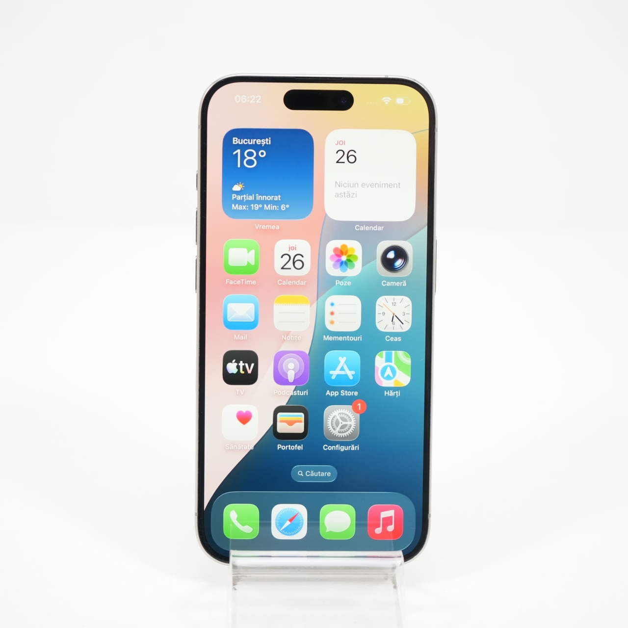 Ecran: 6.1, Refresh Rate 120 Hz Procesor: Apple A17 Pro Memorie RAM: 8 GB Memorie interna: 256GB Camera Foto: Principala 48 MPx, Frontala 12 MPx Stare retea: Liber de rețea