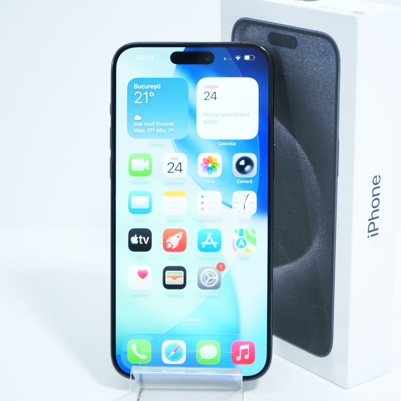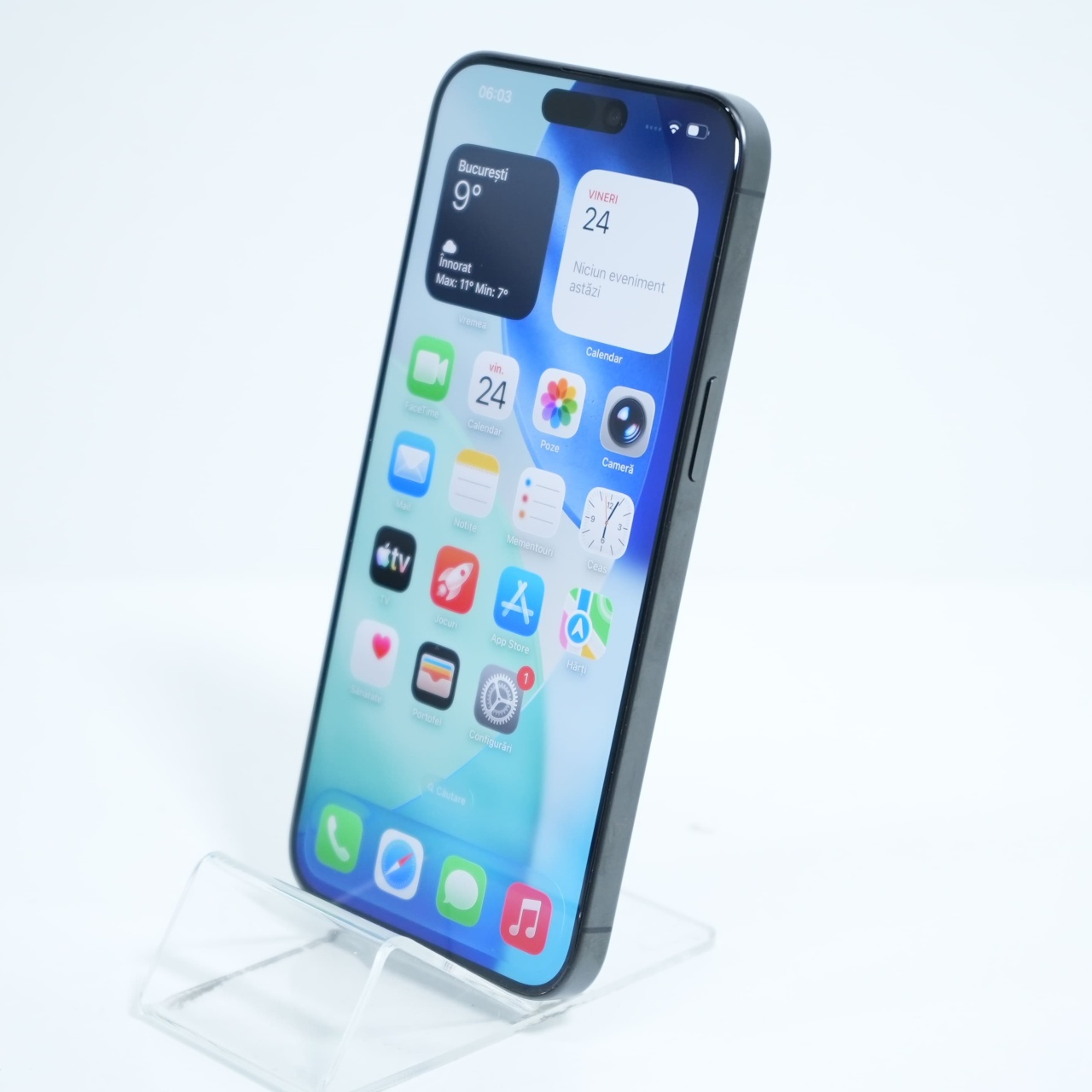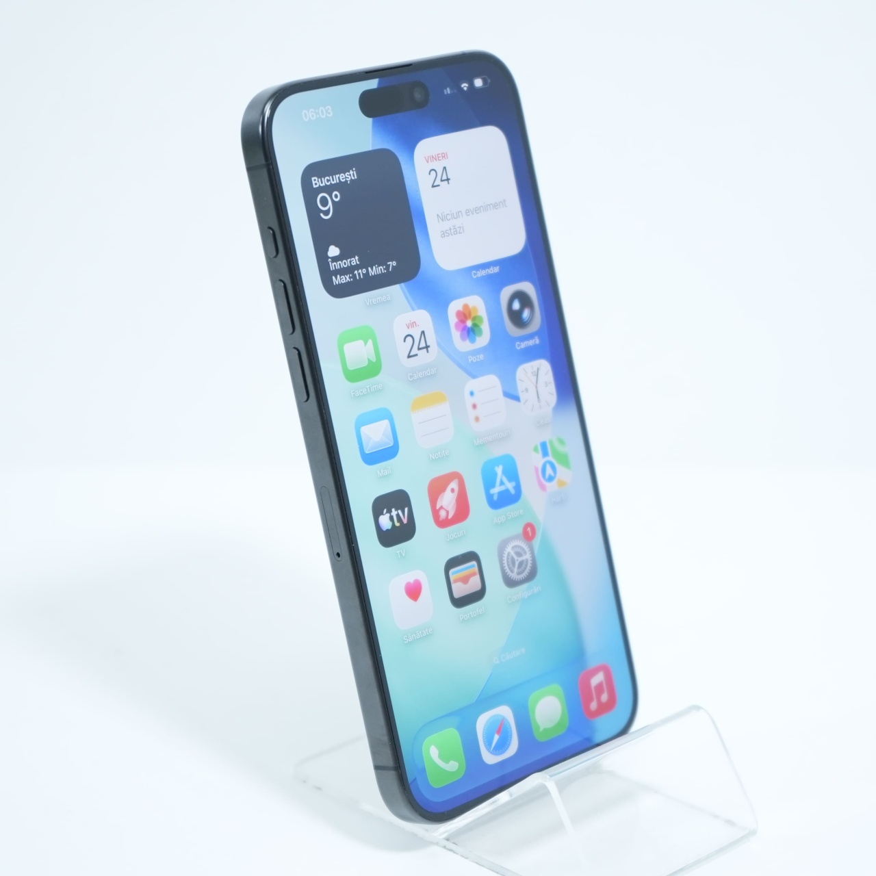 Ecran: 6.7, Refresh Rate 120 Hz Procesor: Apple A17 Pro Memorie RAM: 8GB Memorie interna: 256GB Camera foto: Principala 48 MPx, Frontala 12 MPx Stare retea: Liber de rețea