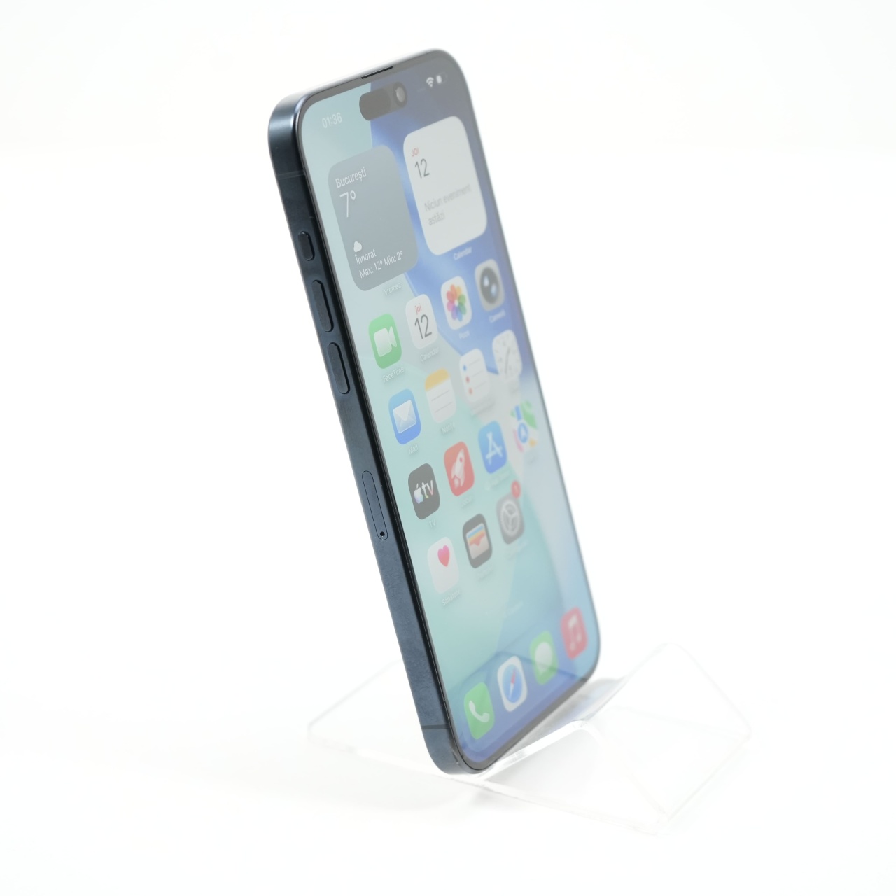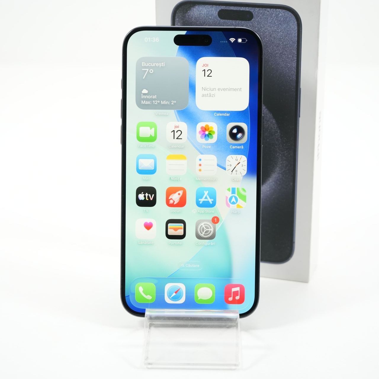 Ecran: 6.7, Refresh Rate 120 Hz Procesor: Apple A17 Pro Memorie RAM: 8GB Memorie interna: 256GB Camera foto: Principala 48 MPx, Frontala 12 MPx Stare retea: Liber de rețea