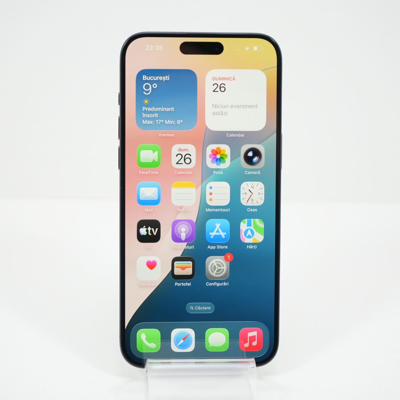 Ecran: 6.7, Refresh Rate 120 Hz Procesor: Apple A17 Pro Memorie RAM: 8 GB Memorie interna: 256GB Camera foto: Principala 48 MPx, Frontala 12 MPx Stare retea: Liber de rețea