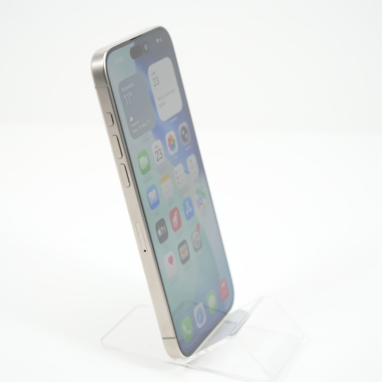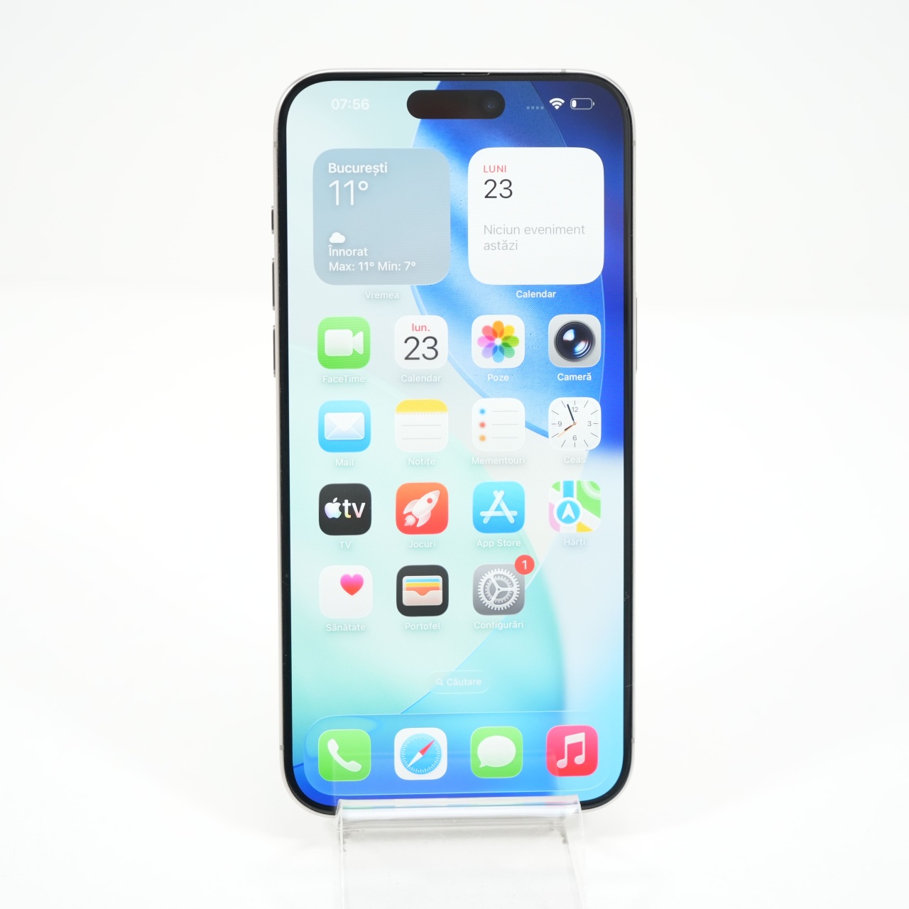 Ecran: 6.7, Refresh Rate 120 Hz Procesor: Apple A17 Pro Memorie RAM: 8GB Memorie interna: 256GB Camera foto: Principala 48 MPx, Frontala 12 MPx Stare retea: Liber de rețea