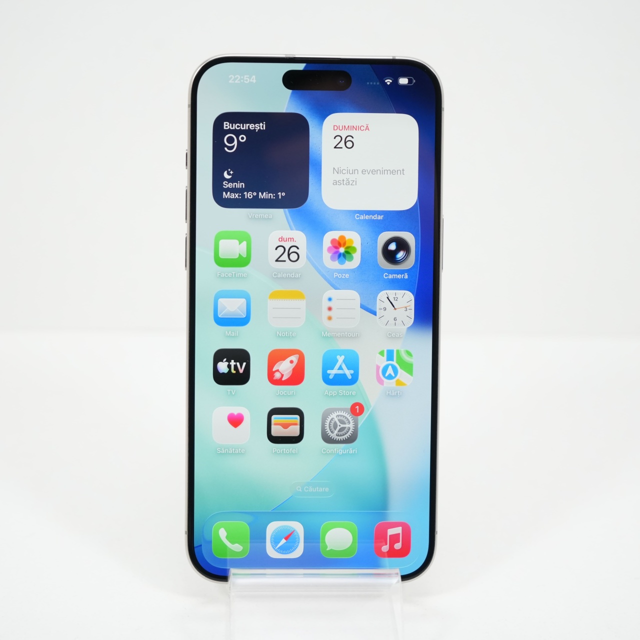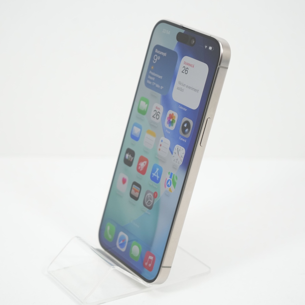 Ecran: 6.7, Refresh Rate 120 Hz Procesor: Apple A17 Pro Memorie RAM: 8 GB Memorie interna: 256GB Camera foto: Principala 48 MPx, Frontala 12 MPx Stare retea: Liber de rețea