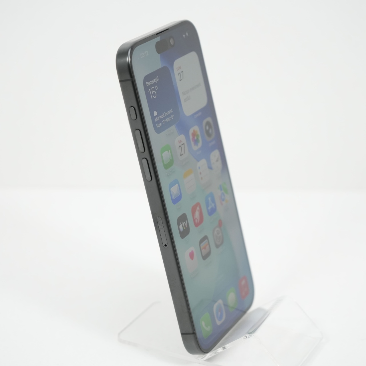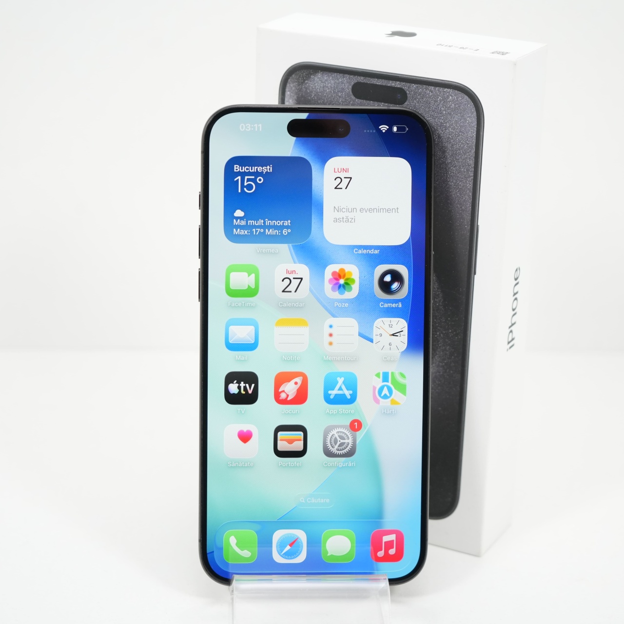 Ecran: 6.7, Refresh Rate 120 Hz Procesor: Apple A17 Pro Memorie RAM: 8GB Memorie interna: 512GB Camera foto: Principala 48 MPx, Frontala 12 MPx Stare retea: Liber de rețea