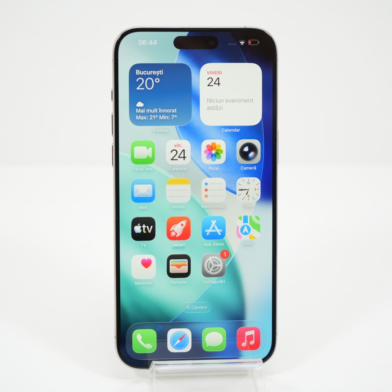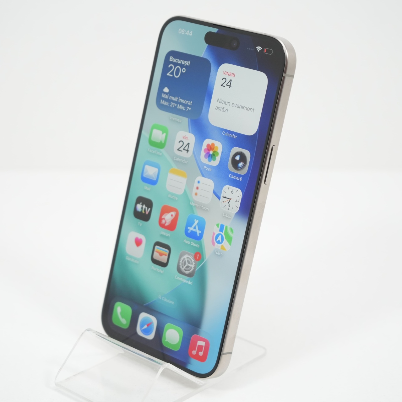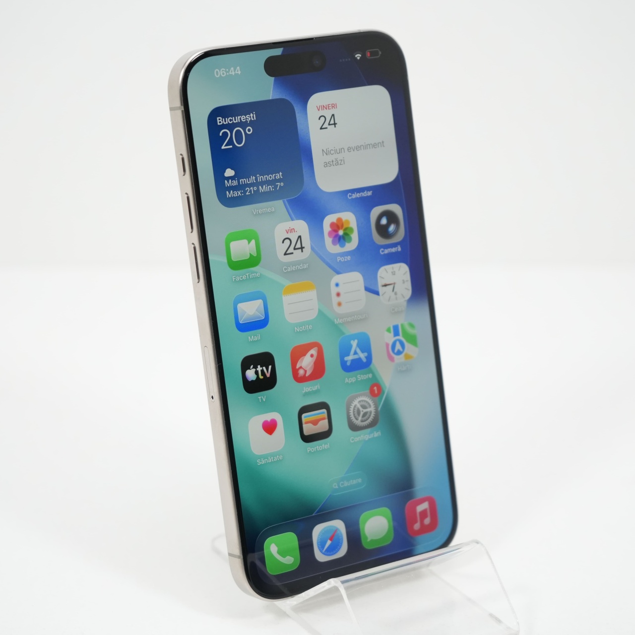Ecran: 6.7, Refresh Rate 120 Hz Procesor: Apple A17 Pro Memorie RAM: 8GB Memorie interna: 512GB Camera foto: Principala 48 MPx, Frontala 12 MPx Stare retea: Liber de rețea
