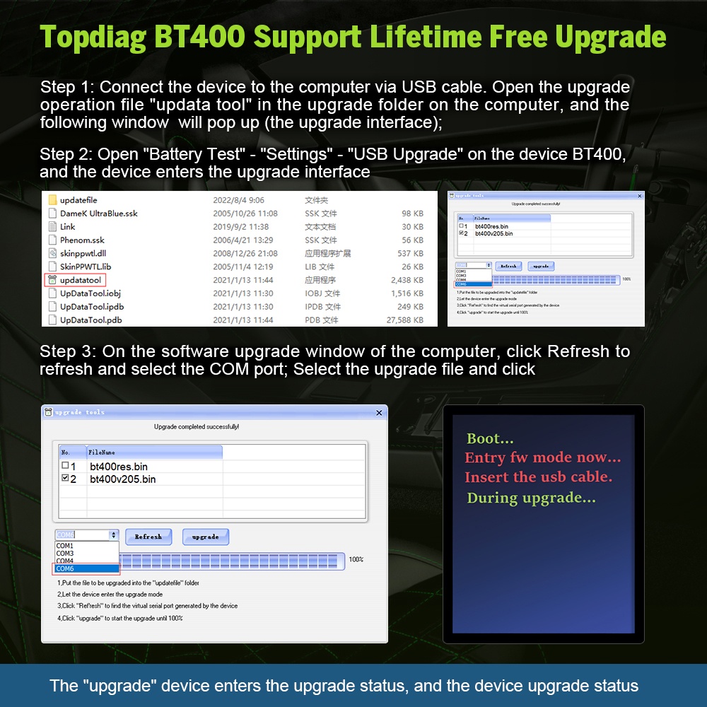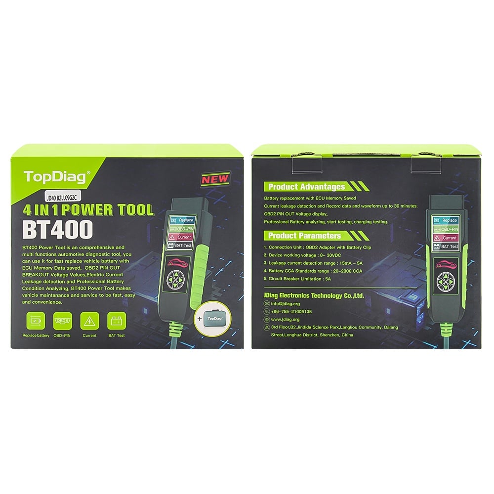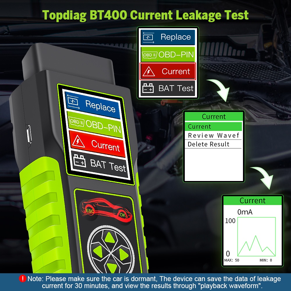 Topdiag BT400 este un tester auto 4 in 1 , profesional si compact, ideal pentru diagnosticarea completa a sistemului electric si a bateriei. Este conceput pentru ateliere, service-uri sau utilizatori individuali care doresc o verificare rapida si precisa a componentelor auto esentiale. Functii principale: ✅ Test baterie auto 12V si 24V – masoara tensiunea, starea de incarcare (SOC), starea de sanatate (SOH), test de pornire (cranking), test incarcare alternator ✅ Test scurgere curent – detecteaza pierderi de curent intre 1 mA si 5 A si permite afisarea grafica a formei de unda ✅ OBD2 Pin Voltage Test – verifica si afiseaza voltajul individual pe fiecare pin al conectorului OBD ✅ Battery Replacement Mode – permite inlocuirea bateriei fara pierderea setarilor ECU ✔ Compatibilitate larga cu marci auto: BMW, Mercedes-Benz, Audi, Volkswagen, Ford, Opel, Renault, Dacia, Peugeot, Citroen, Fiat, Toyota, Honda, Mazda, Mitsubishi, Nissan, Hyundai, Kia, Suzuki, Volvo, Skoda, Seat, Jeep, Land Rover si multe altele. ✔ Compatibil cu tipuri de baterii: AGM, GEL, EFB, Plumb-Acid ✔ Suporta standarde de testare: CCA, JIS, GB, SAE, MCA, CA, DIN, IEC, EN, BCI ✔ Limbi disponibile: Engleza, Germana, Franceza, Spaniola, Italiana, Portugheza, Poloneza, Chineza, Japoneza, Coreeana Specificatii tehnice: Tensiune de operare: 6V – 30V DC Interval masurare curent de scurgere: 1 mA – 5 A Domeniu test CCA: 20 – 2000 CCA Display: ecran color LCD de 1.8 inch Porturi disponibile: ✅ Port OBD2 16 pini ✅ Port USB pentru actualizari ✅ Cablu cu clesti pentru conectare la baterie Pachetul contine: ✅ Dispozitiv Topdiag BT400 ✅ Cablu USB pentru upgrade software ✅ Cablu cu clesti pentru conectare la baterie ✅ Geanta de transport ✅ Manual de utilizare Beneficii cheie: ✅ Actualizare gratuita pe viata prin USB ✅ Usor de folosit cu interfata prietenoasa si butoane de navigare ✅ Diagnostic rapid, sigur si precis pentru prevenirea defectiunilor electrice