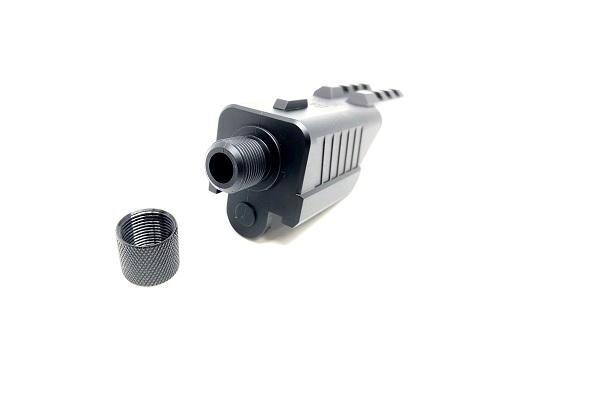 Carrello con filettatura per silenziatore e upper rail specifico per USP elettrica Marui. Con upper rail da 20 mm di larghezza e filetto di 14 mm CCW.