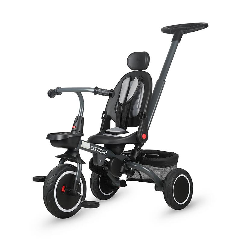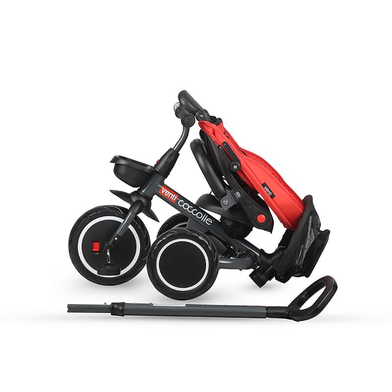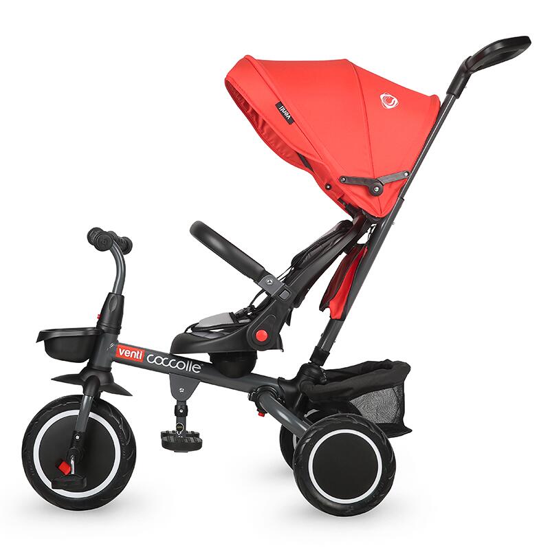 Tricicleta pentru copii Coccolle Venti Chili Pepper multifunctionala, cu spatar ajustabil, cu pozitie de somn, sezut rotativ 360 grade, roti de cauciuc, 2 seturi de suporti de picioare de la 10 luni pana la 25 kg