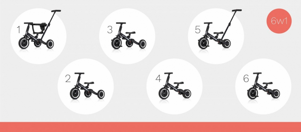 TREMIX UP este o bicicleta tricicleta inovatoare care poate fi utilizata in 5 versiuni diferite. Schimbarea versiunii este foarte usoara si nu necesita utilizarea unor instrumente. Apasand 3 buto