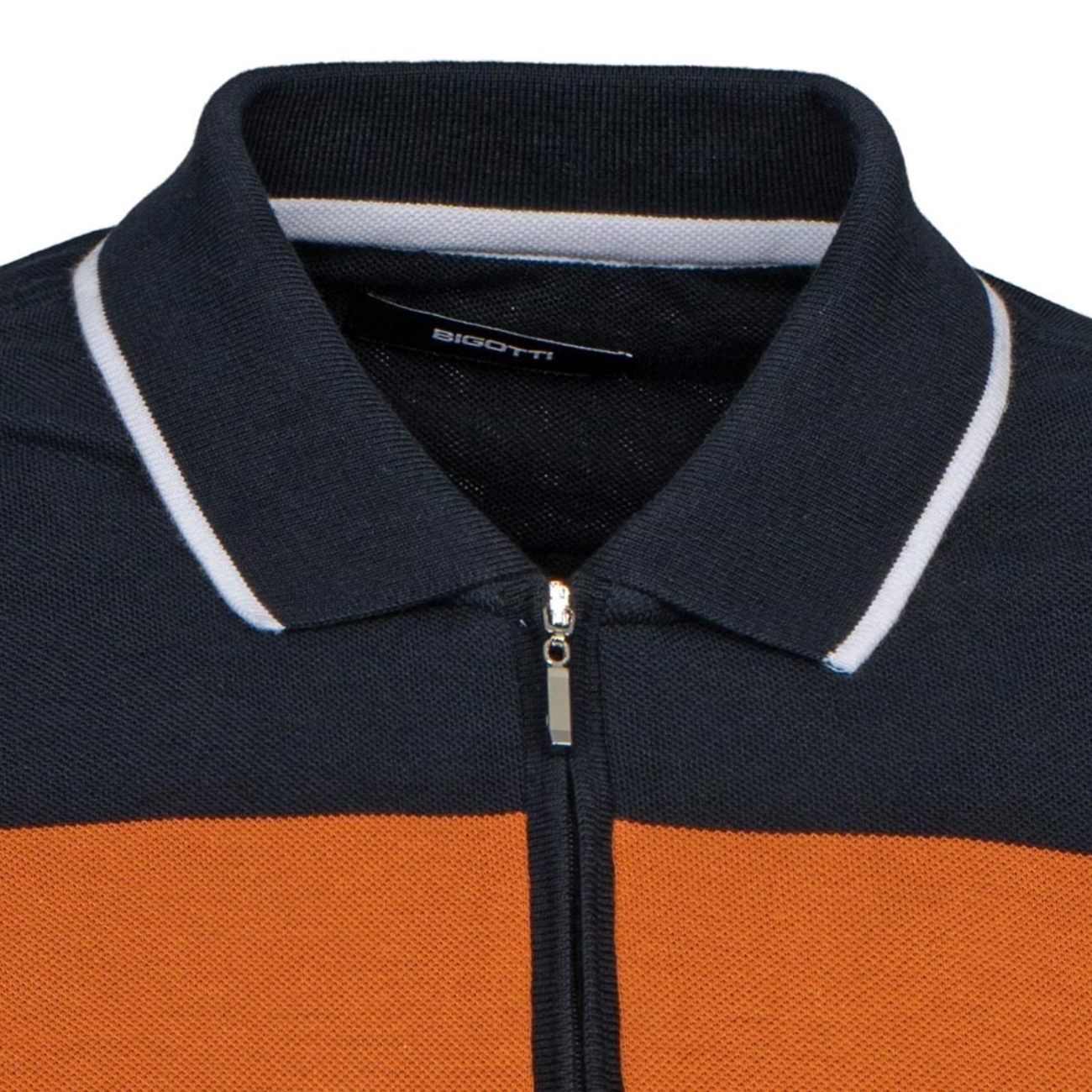 Tricou polo casual din bumbac 100%, cu un design modern în dungi late orizontale portocalii și accente contrastante alb-bleumarin. Gulerul tip polo cu fermoar și detalii subtile completează aspectul contemporan, fiind ideal pentru ținutele relaxate, dar stilate din sezonul cald.