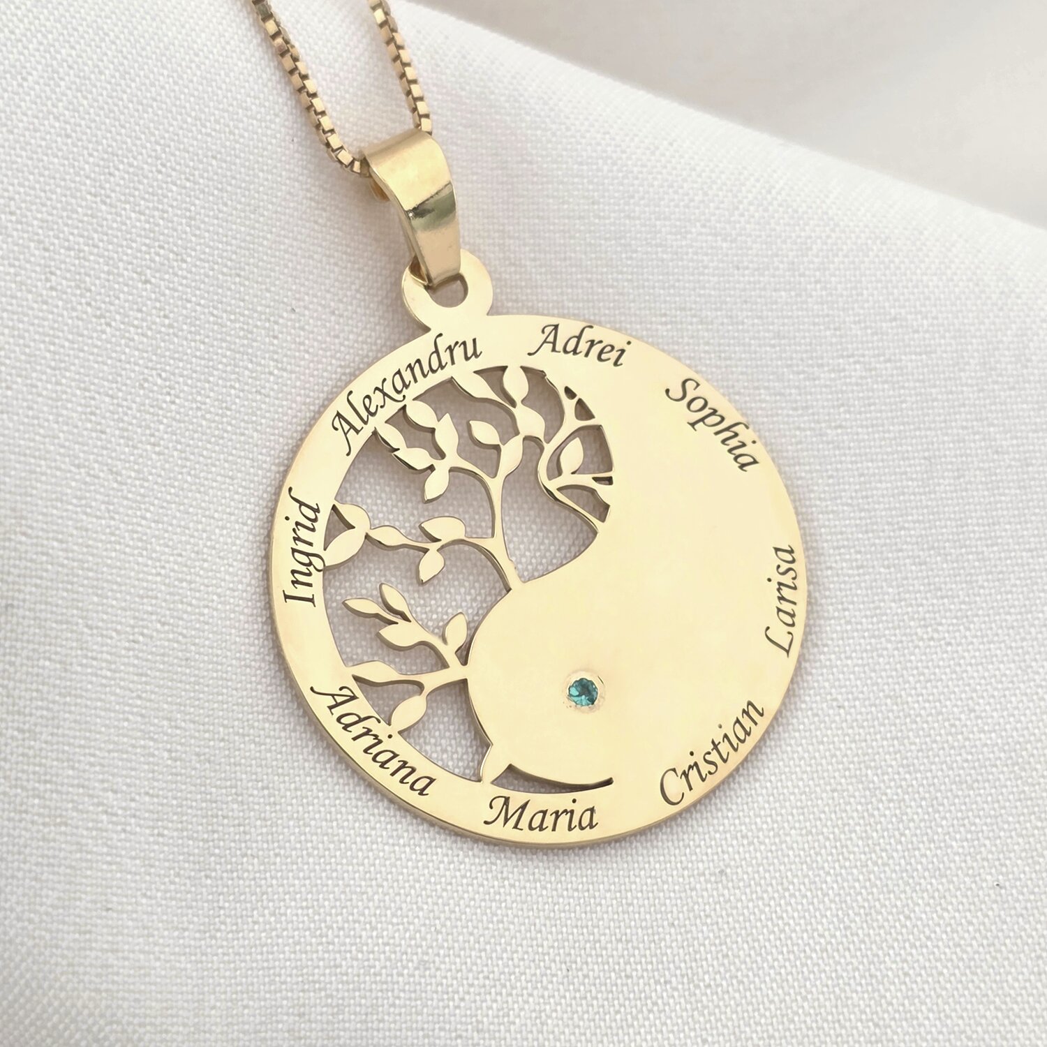 Lantisor cu Pandantiv Rotund Copacul Vietii Yin & Yang din Argint 925 Placat cu Aur de 18K - Decorat cu Smarald si Personalizabil cu 8 Nume