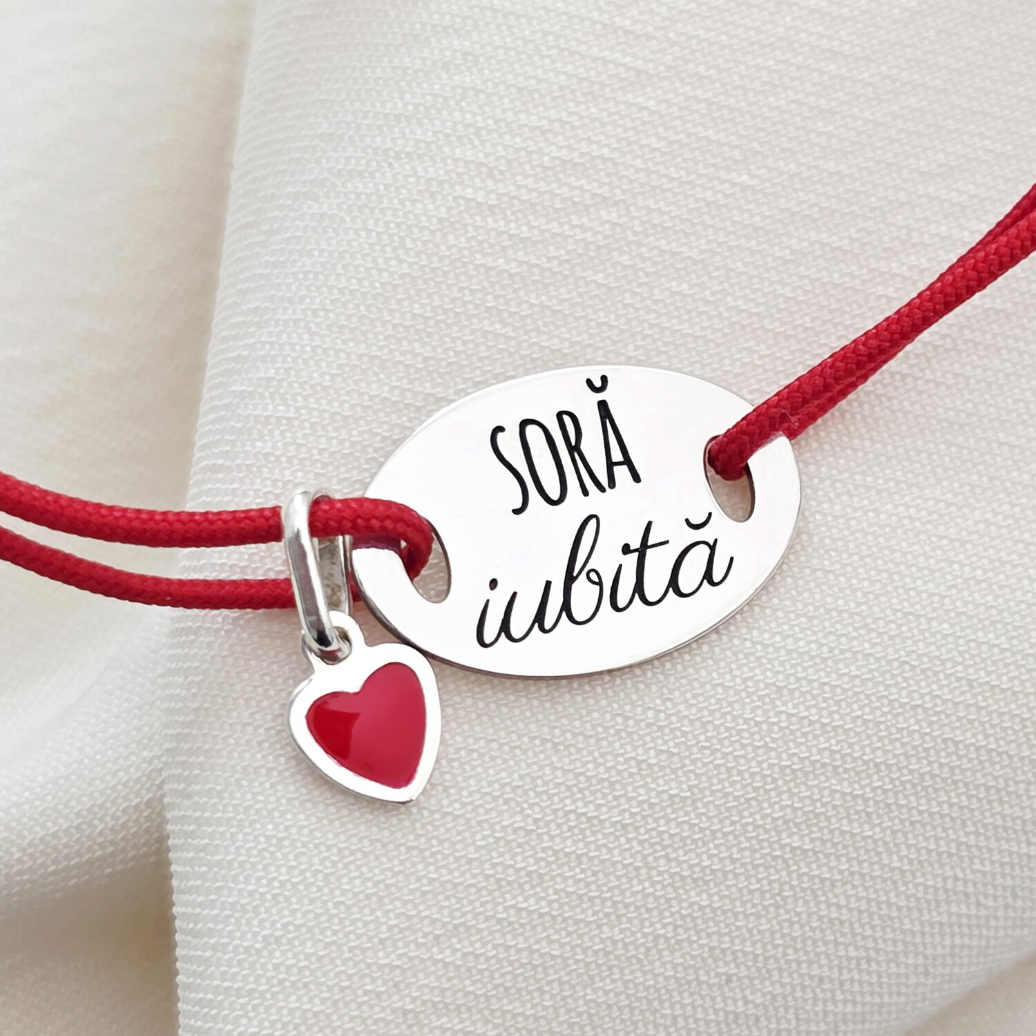 Bratara Mama, cadou de la Dumnezeu - Argint 925 si inima cu email rosu - Snur reglabil, diverse culori