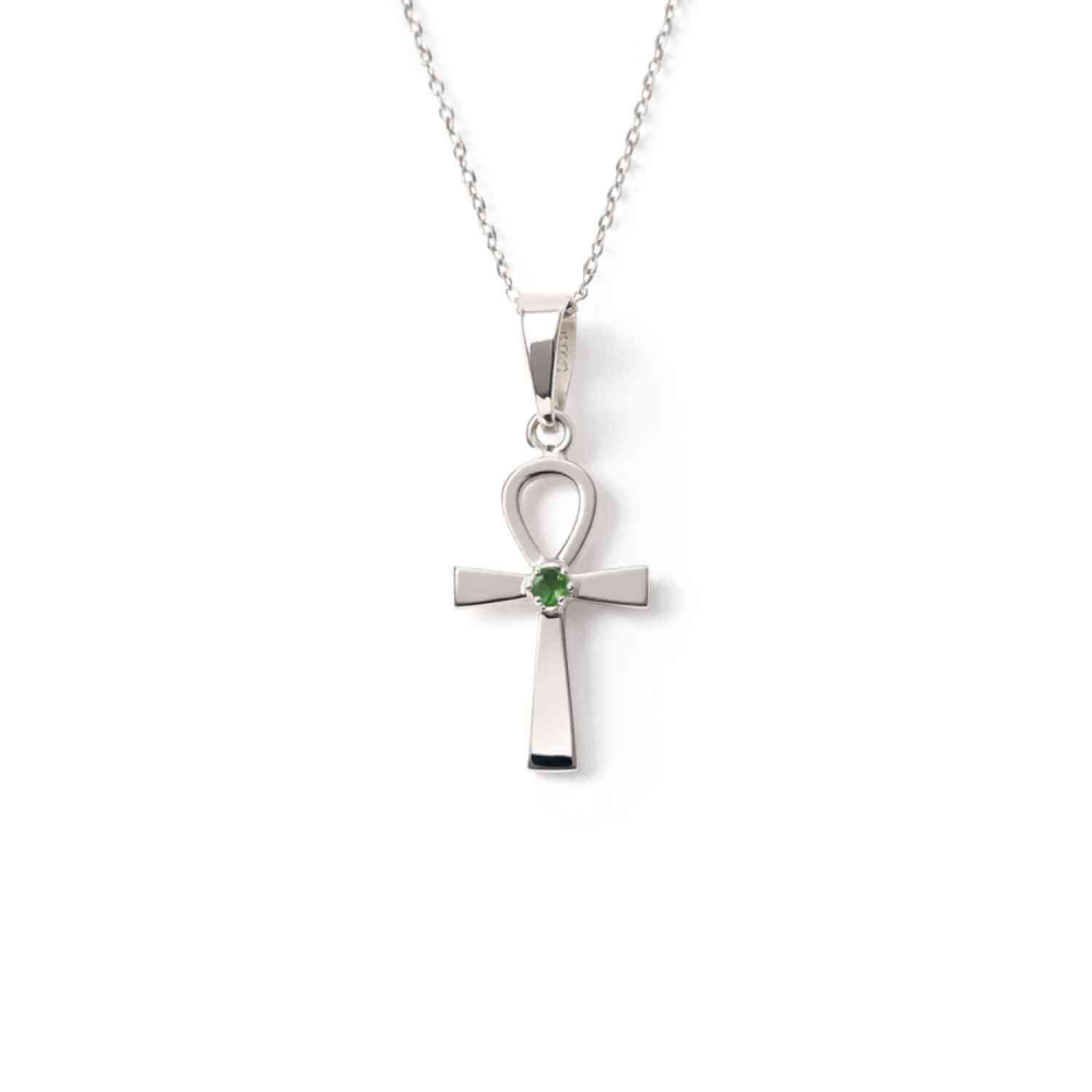 Colier Argint 925 Crucea ANKH cu Moldavit natural fatetat , simbol al vietii si transformarii